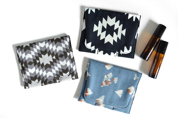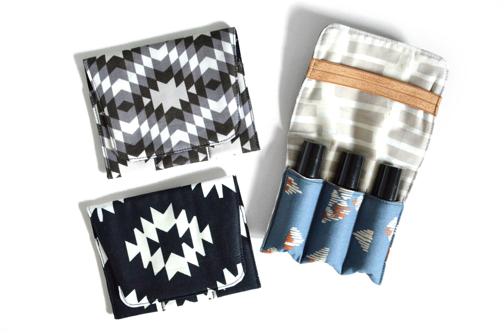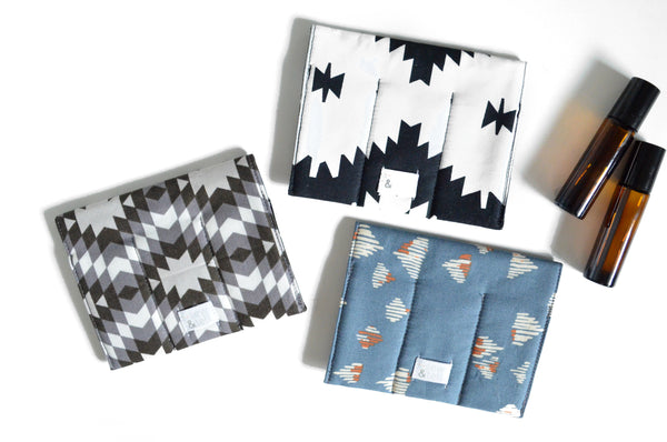 These roller-bottle holders are a must-have for keeping your essential oils safely organized on-the-go! They feature three pockets for 10ml sized roller-bottles, and are made withย an inner-layer of cotton quilt batting to keep those glass bottles safe! These holders also feature an easy elastic closure which loops around the back, with no metal snaps or buttons to clank against your bottles. Not only are these little holders super functional, they also make the perfect giftย whether shopping for yourself or someone special!ย