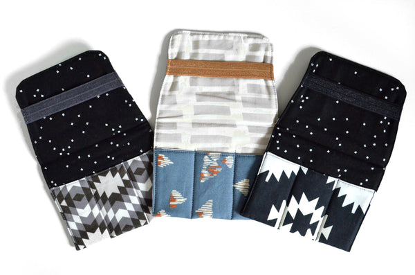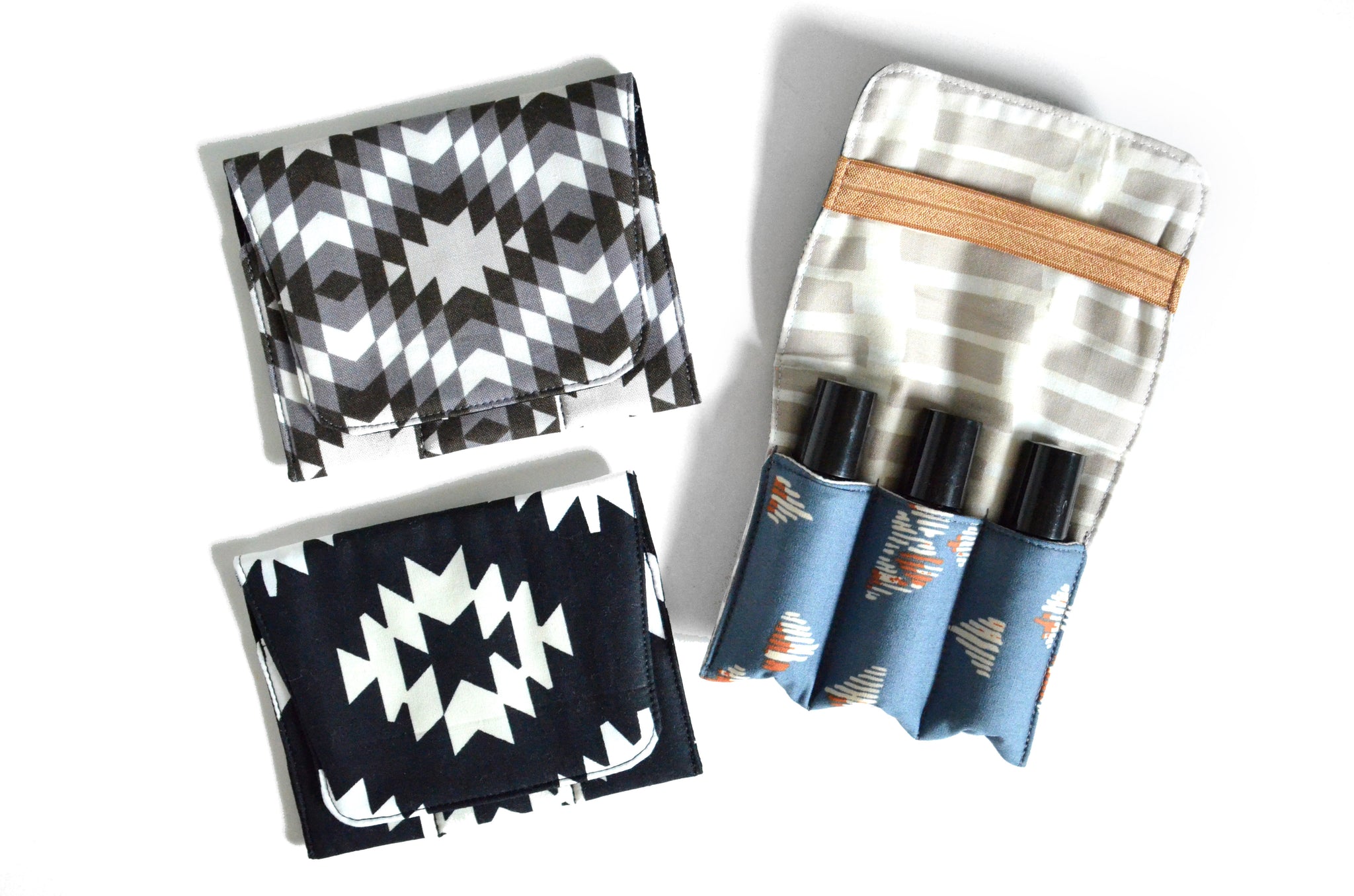 โ These grey and black roller-bottle holders features three beautiful aztec-themed prints!ย