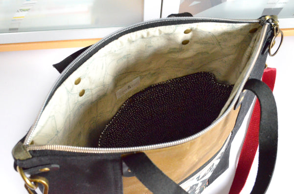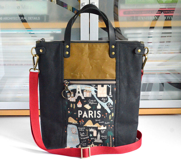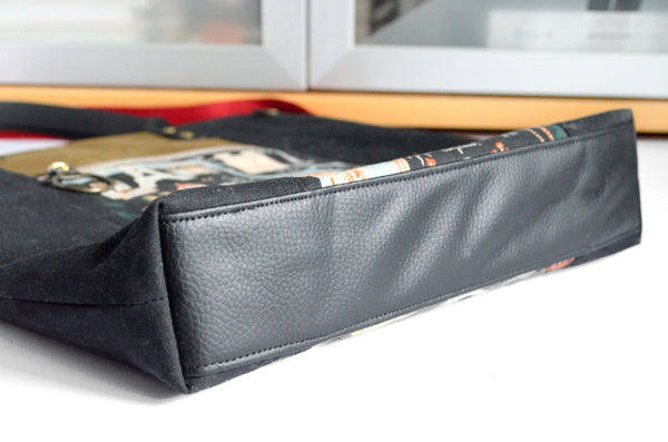 โ˜… This tote bag features aย black & tanย waxed-canvasย exterior, with a beautifulย Rifle Paper Co "Bon Voyage" canvasย feature panel!ย This bag includes a coordinating adjustable crossbody strap.