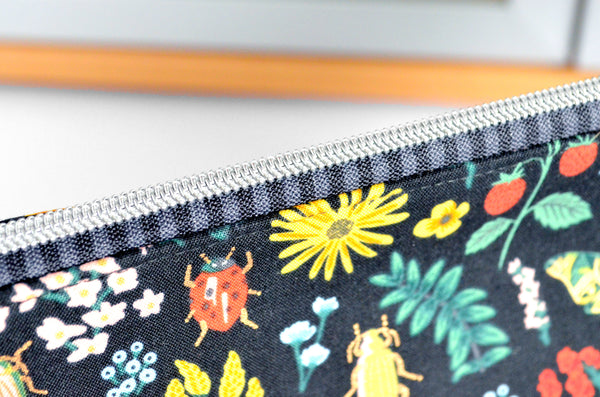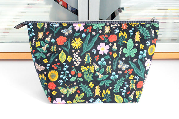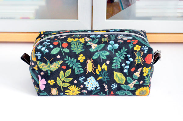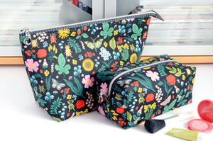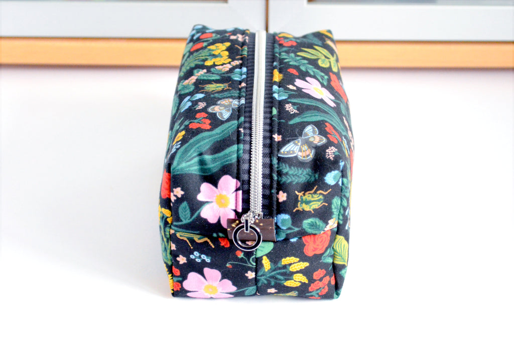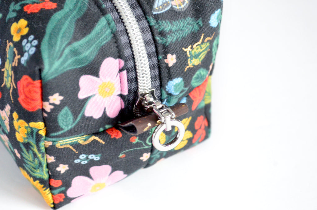 These black toiletry bags are made with a beautiful floral print fabric designed by Rifle Paper Co! They also feature matching faux-metal zippers & cork leather zipper tabs. Please note, exact fabric placement may vary from some of the photos shown.
