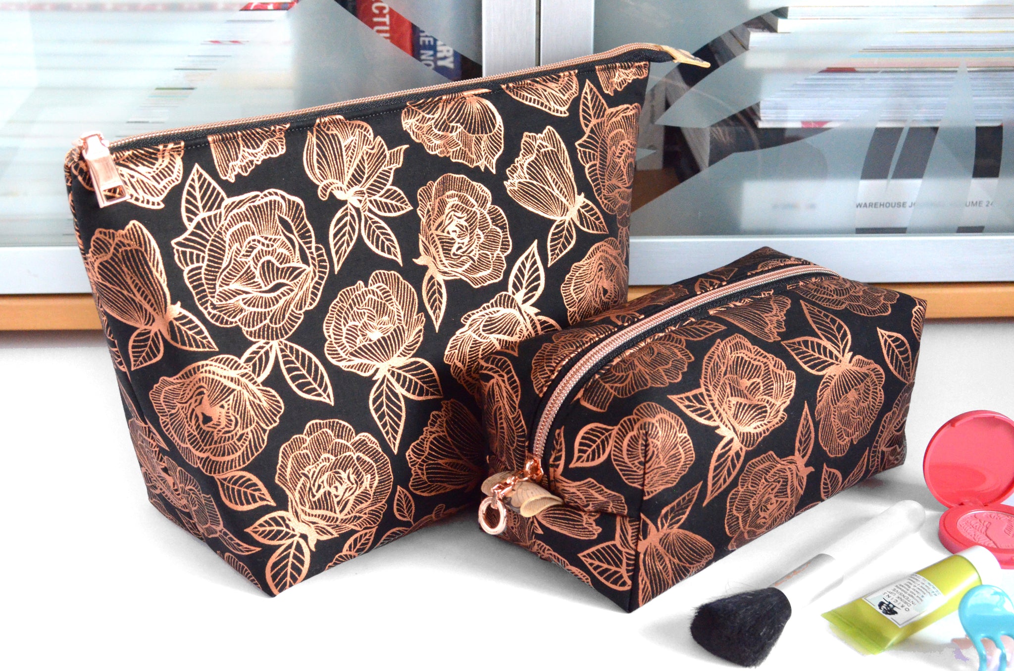 These black & rose gold toiletry bags are made with aย beautifulย floral cotton fabric designed by Ruby Star Society! They also feature matching faux-metal zippers & cork leather zipper tabs. Please note, exact fabric placement may vary from some of the photos shown.