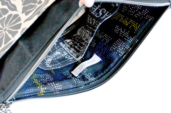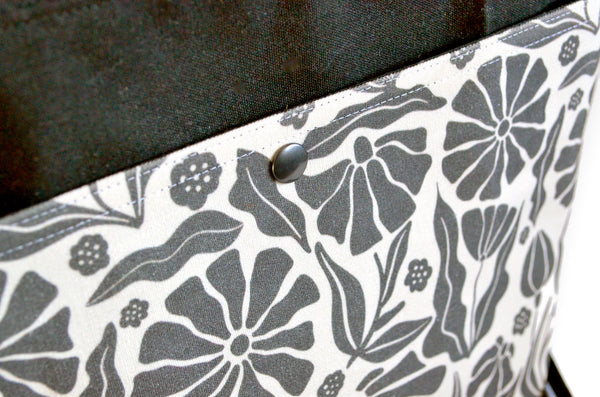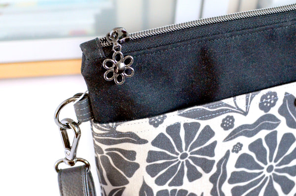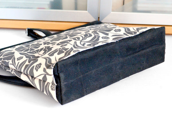 This crossbody bag features a lovely black waxed-canvas exterior, with a beautiful floral feature fabric! This bag includes a coordinating adjustable faux-leather crossbody strap.