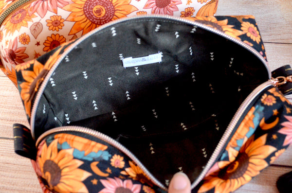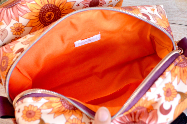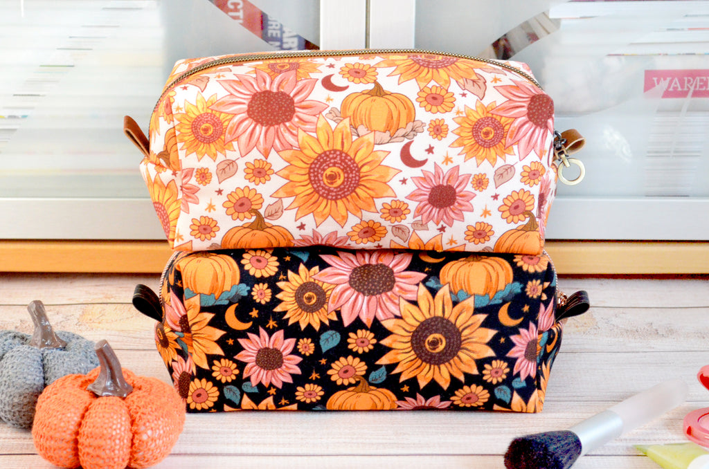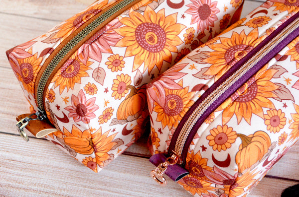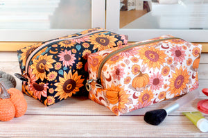These black & white boxy toiletry bags feature a variety of fun cotton prints with a pumpkin floral design! They also feature gorgeous faux-metal zippers in a variety of finishes, and coordinating cork accent zipper tabs.