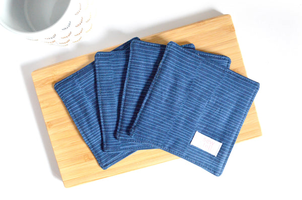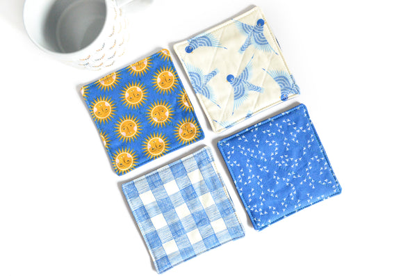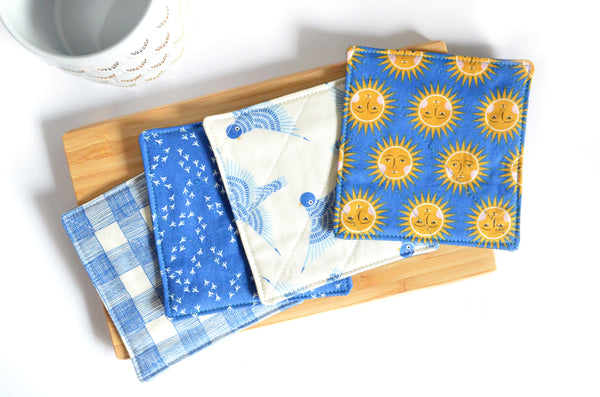 Our quilted fabric coaster sets are sure to bring a pop of colour to your coffee table or dining room, while also providing you with practicality and versatility! Made with a layer of cotton quilt-batting inside, these coasters are great at soaking up unwanted condensation from your drink, and wonโt stick to your glass when you pick it up! Available in a wide-range of fun prints and colours, these coasters also make for the perfect unique housewarming or hostess gift!