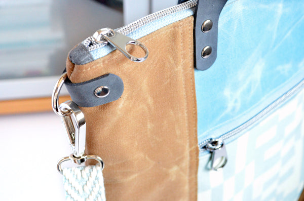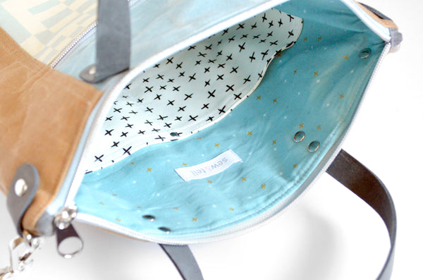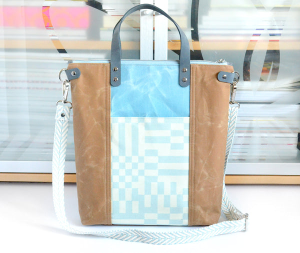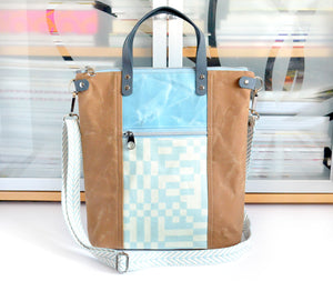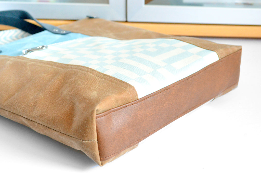 This tote bag features a tan-brown & blue waxed-canvasย exterior, with a beautiful checker canvas feature panel! This bag includes a coordinating adjustable crossbody strap.