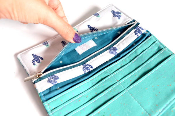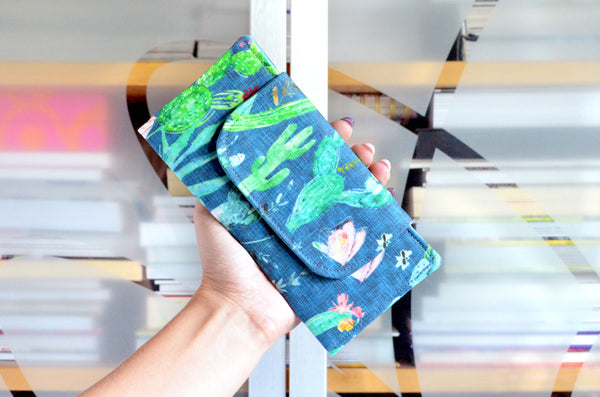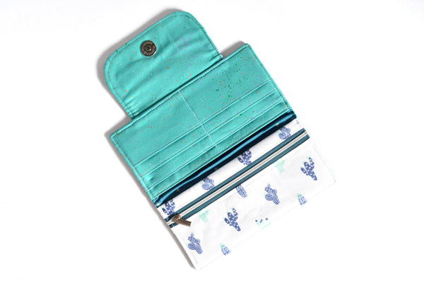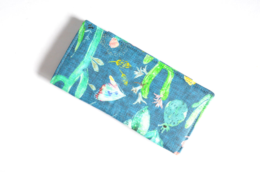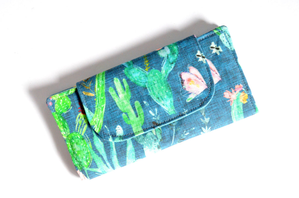 โ This wallet features a blue cactus print canvas fabric, with a coordinating interior! Please note, exact fabric placement may vary from some of the photos shown.