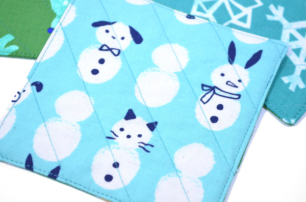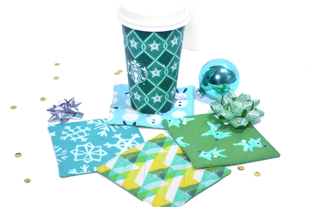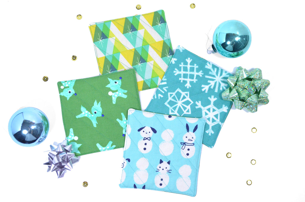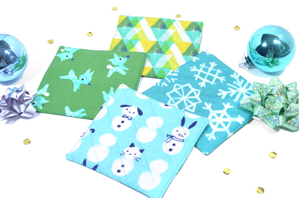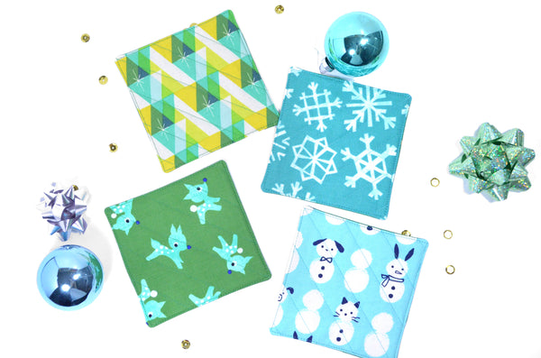 โ This set of four fabric coasters features a fun set of bright blue & green holiday prints, perfect for your next cocktail party or Christmas gathering!