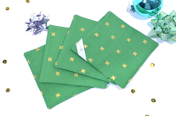 Our quilted fabric coaster sets are sure to bring a pop of colour to your coffee table or dining room, while also providing you with practicality and versatility! Made with a layer of cotton quilt-batting inside, these coasters are great at soaking up unwanted condensation from your drink, and wonโt stick to your glass when you pick it up! Available in a wide-range of fun prints and colours, these coasters also make for the perfect unique housewarming or hostess gift!
