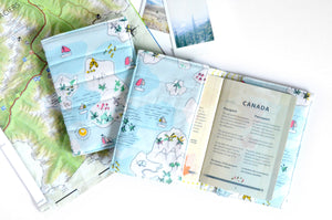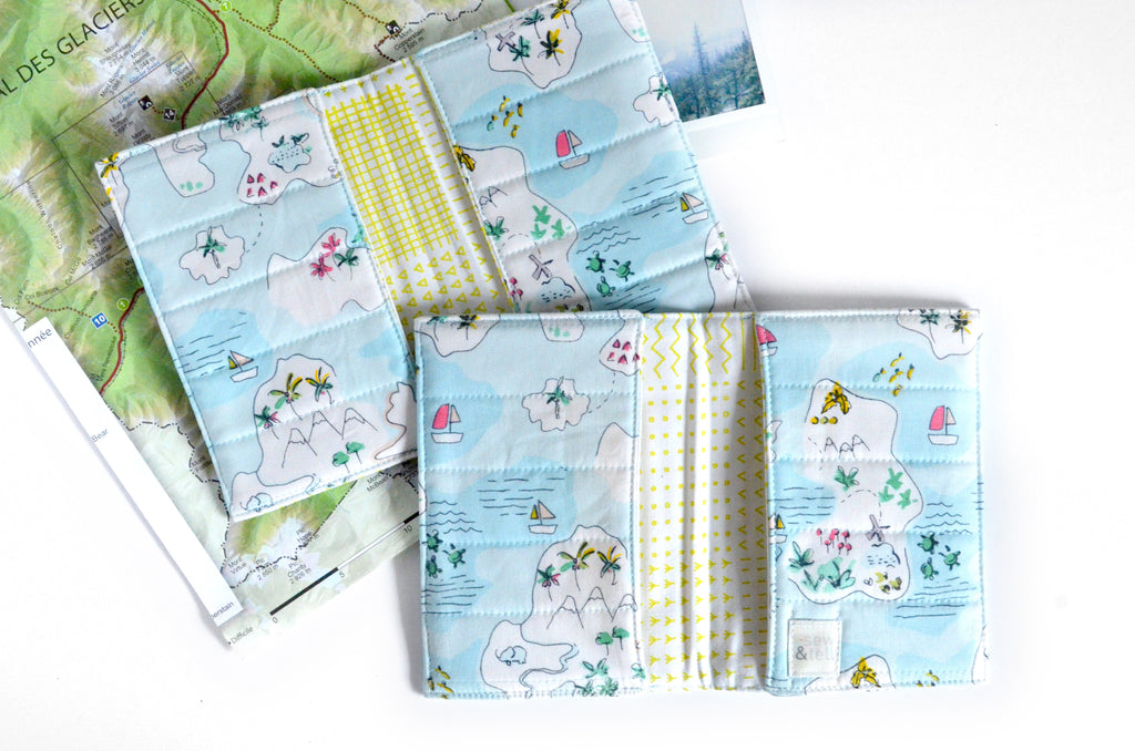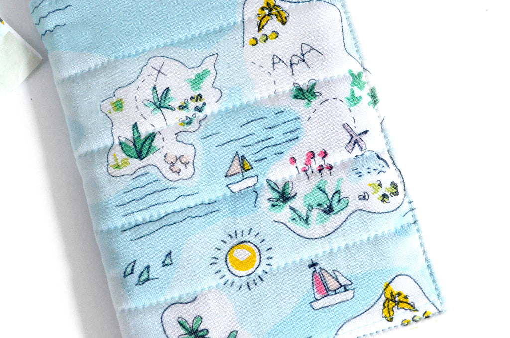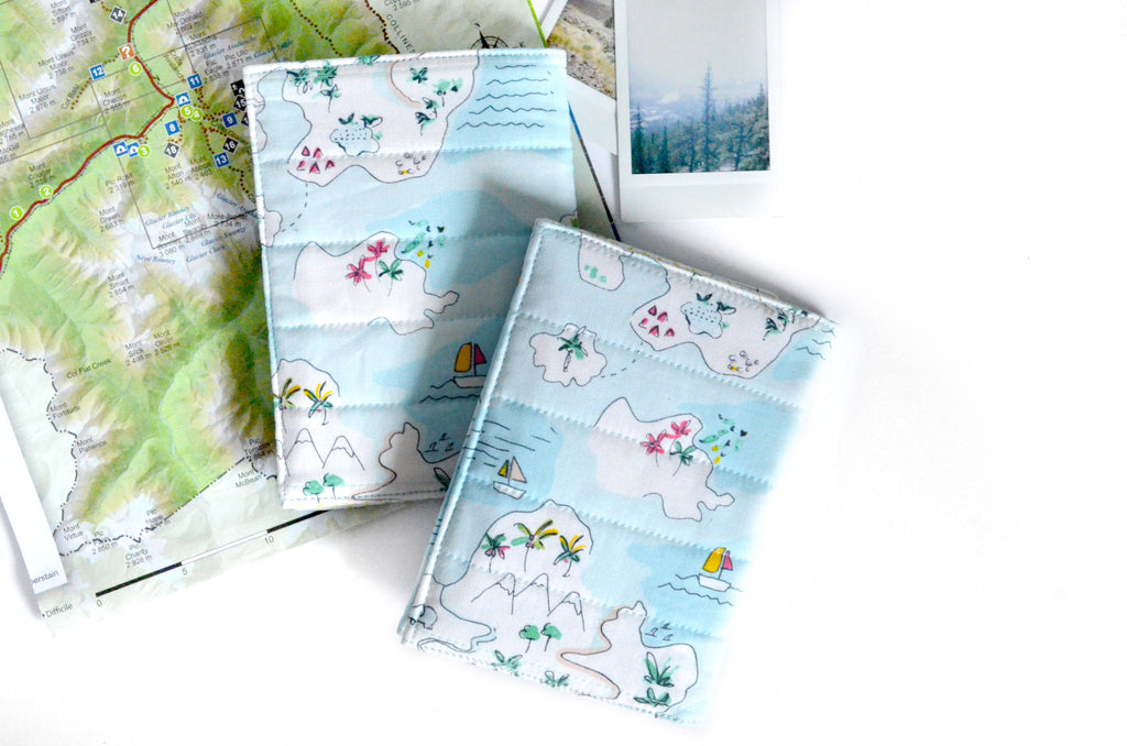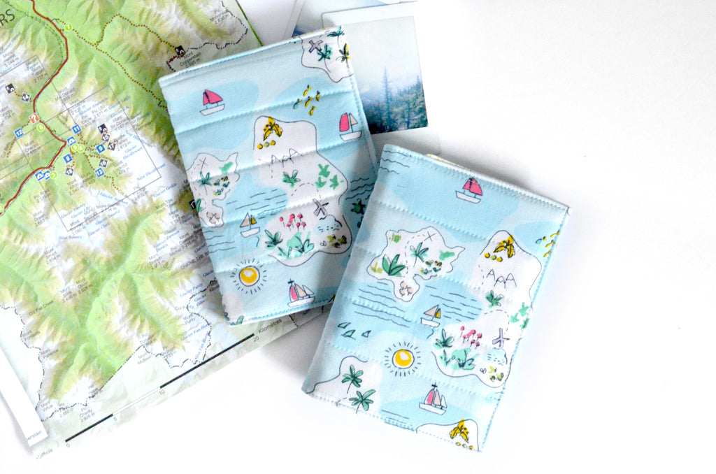 โ Thisย light blueย passport cover features a fun "treasure map" fabric! Please note that exact fabric placement may vary from some of the photos shown.