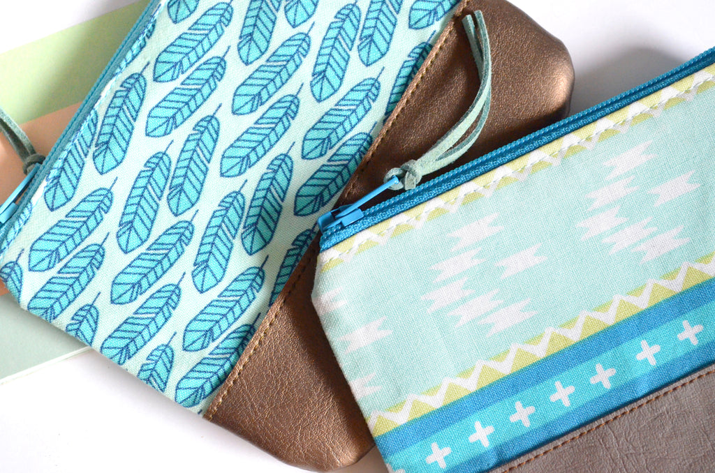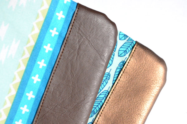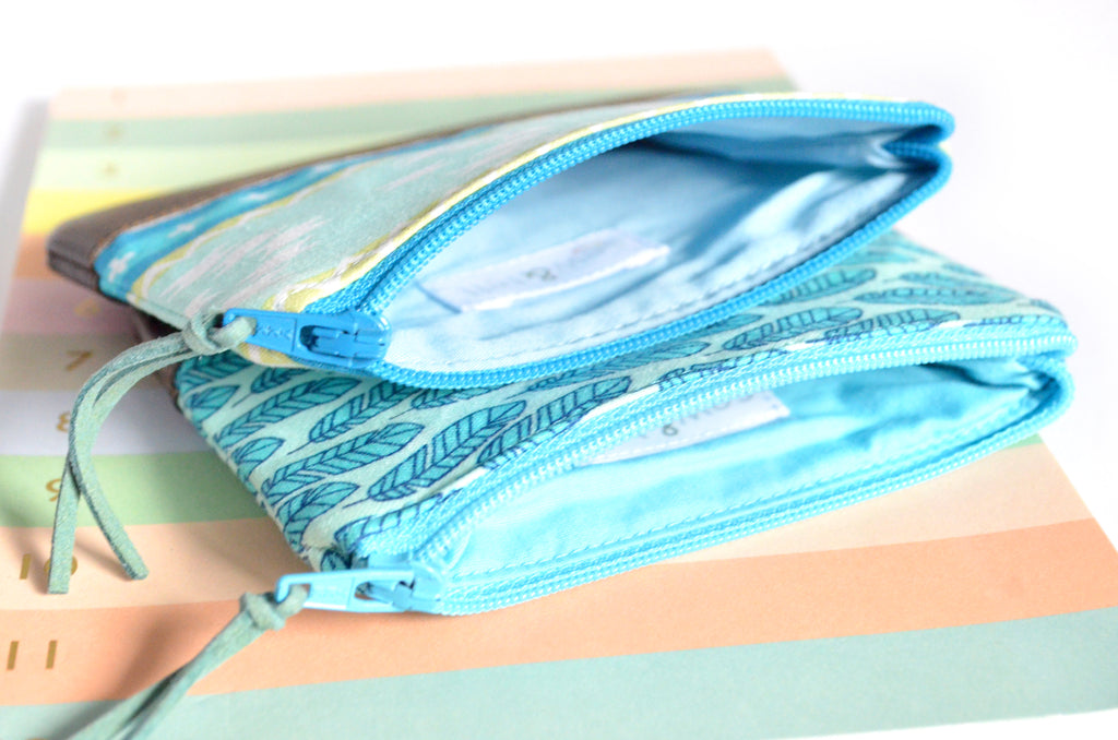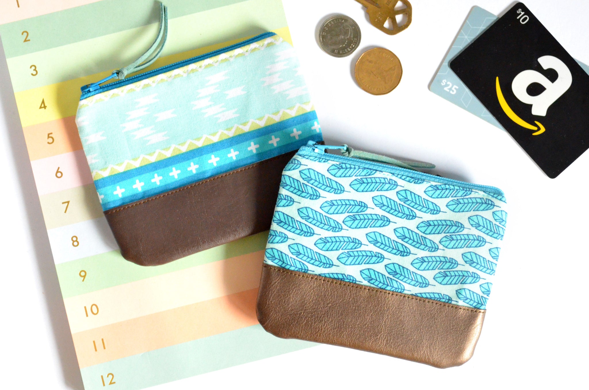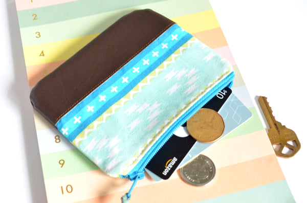 โ These bright blue coin purses feature a beautiful feather & boho print fabric, accented with a leather trim across its bottom