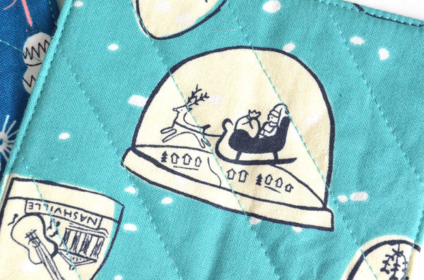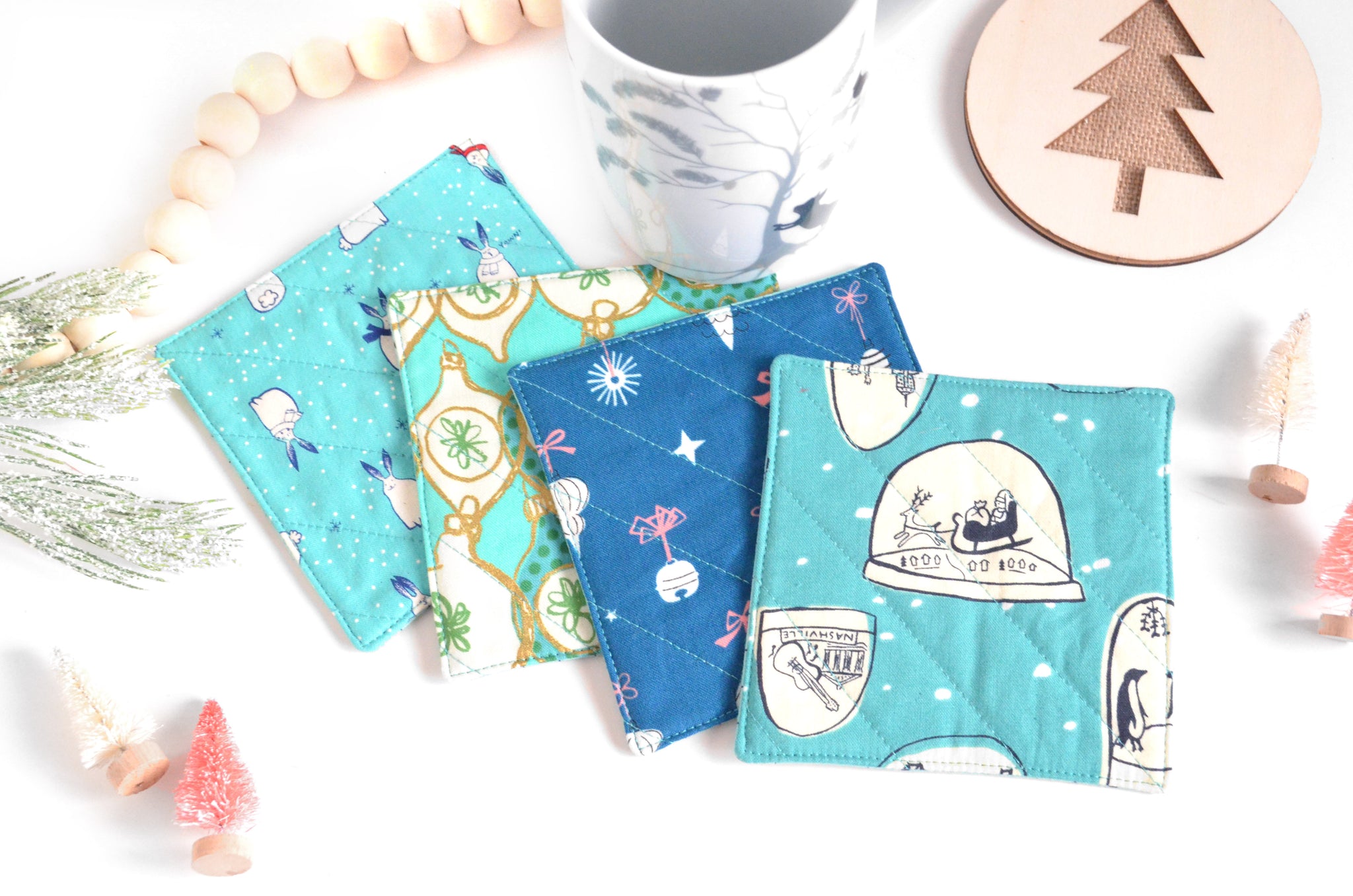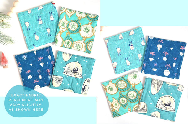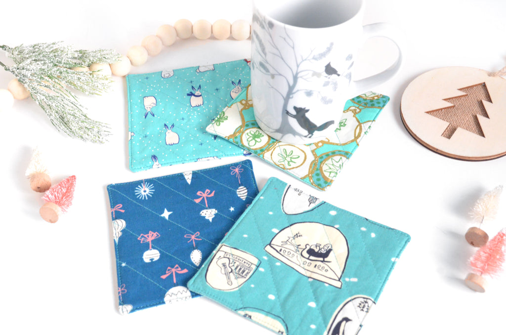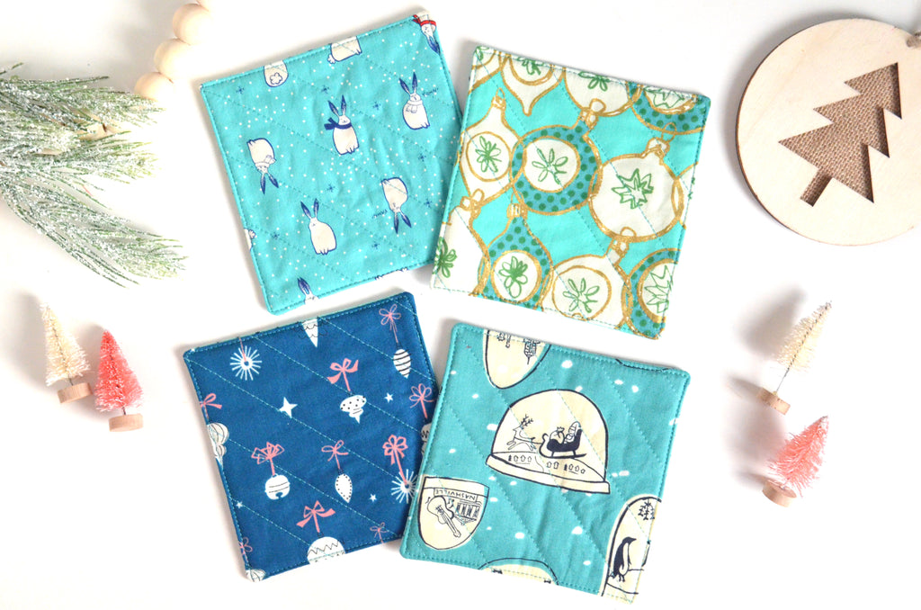 โ This set of four fabric coasters features a fun selectionย of bright holiday prints, perfect for adding some whimsy to your holiday decor!ย