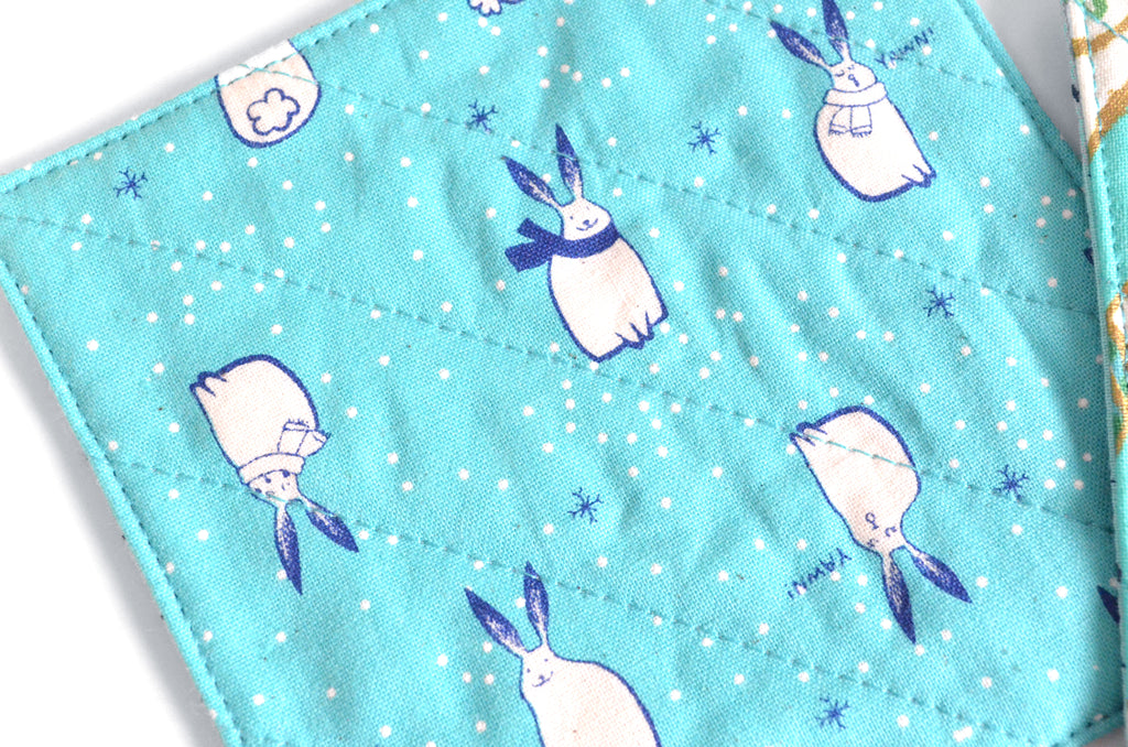 โข Coasters are reversible, with a coordinating fabric print on the back