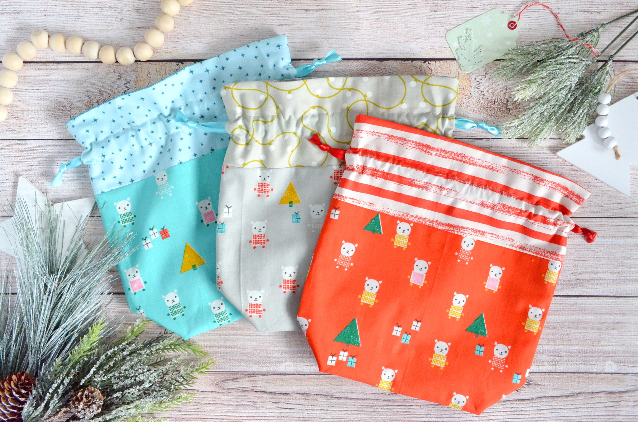โ Theseย bright drawstring bags are made from a variety of beautifulย holiday-themed fabrics! Please note, exact fabric placement may vary from some of the photos shown.ย