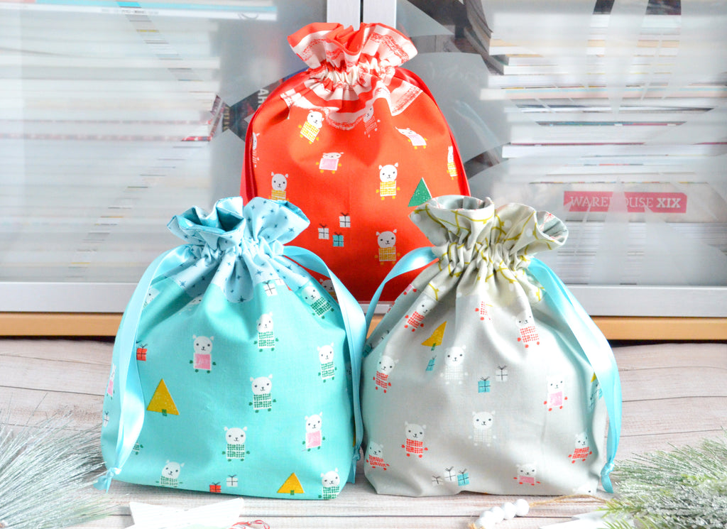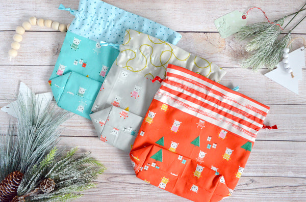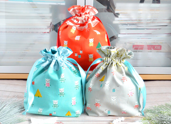 These adorable fabric gift bags are made from a variety of fun and festive cotton prints perfect for the holidays! Not only do these bags make gift-wrapping fast and easy, theyโre also a great eco-friendly alternative to traditional paper wrapping. These bags can be kept to re-use during the holidays year after year, or immediately afterwards for everyday storage. The simple-to-use pull ties make them perfect for storing childrenโs toys and games, while also making great knitting or sewing bags, keeping your supplies for each project organized.ย These bags are sure to make your friends and family smile when they receive their gift wrapped up in one these!