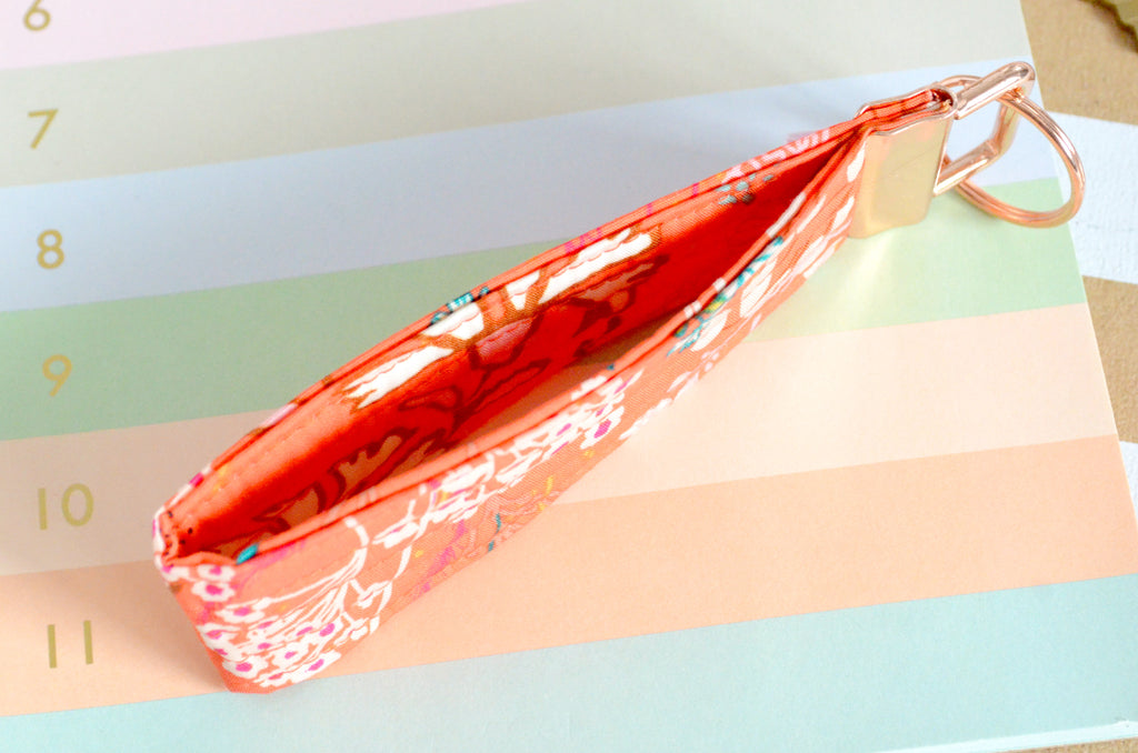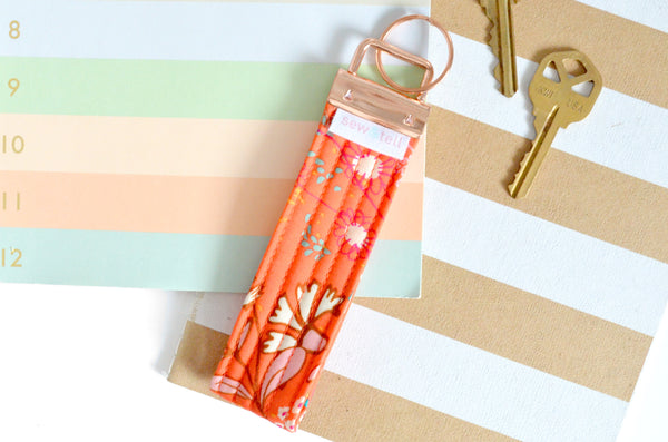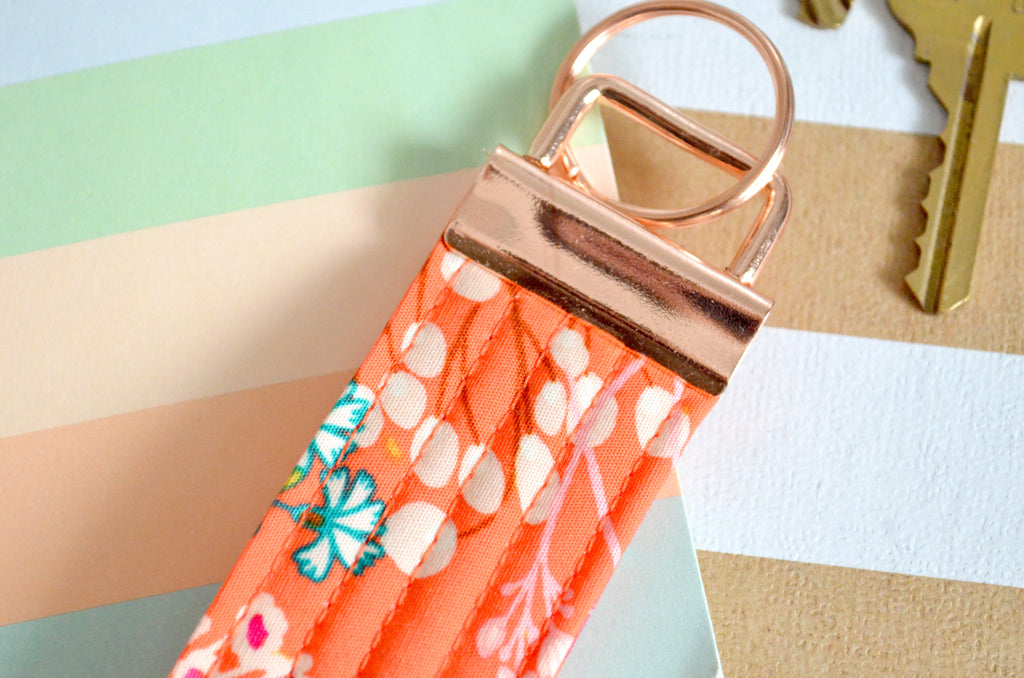โ This bright orange key fob features a fun floral-print fabric! Please note that exact fabric placement may vary, as shown in the photos.