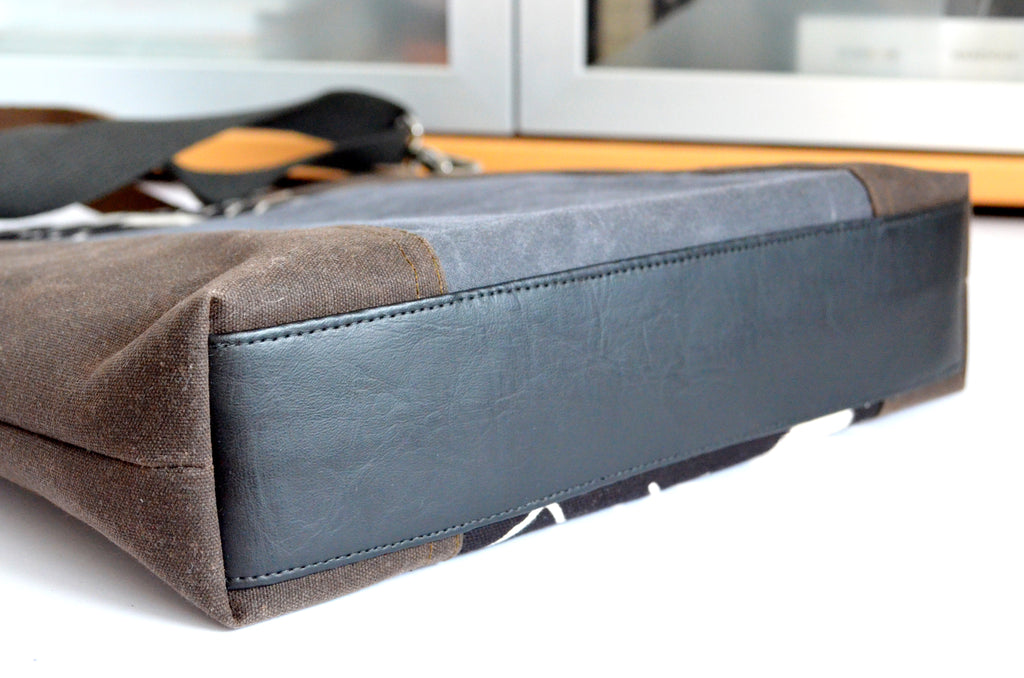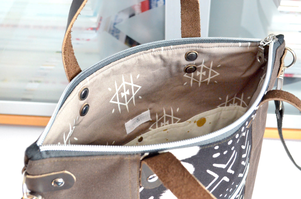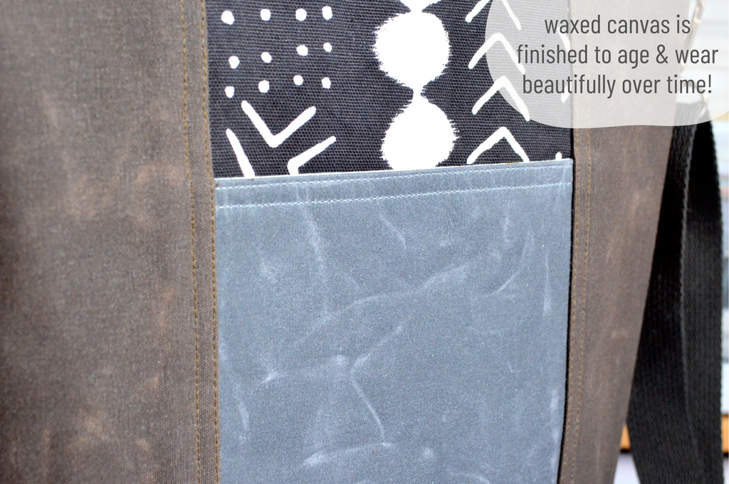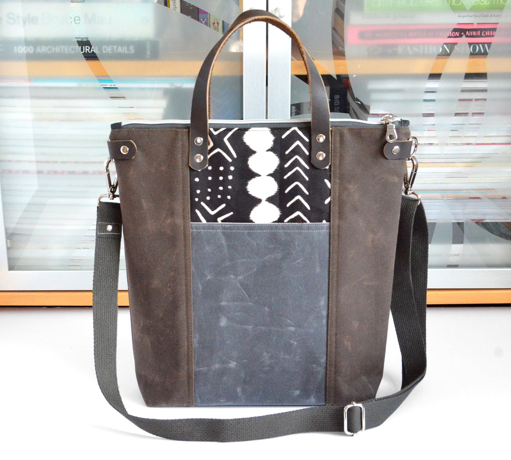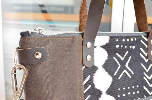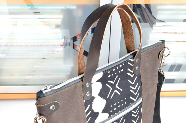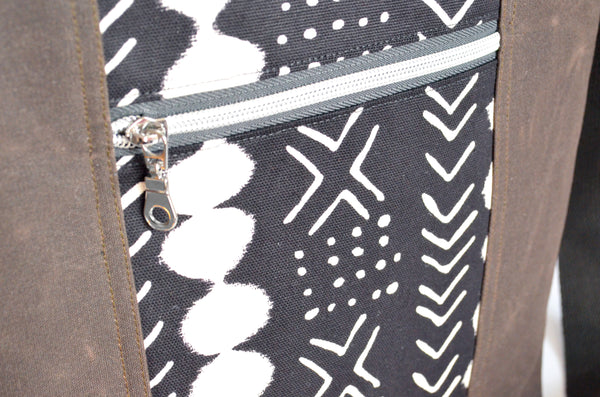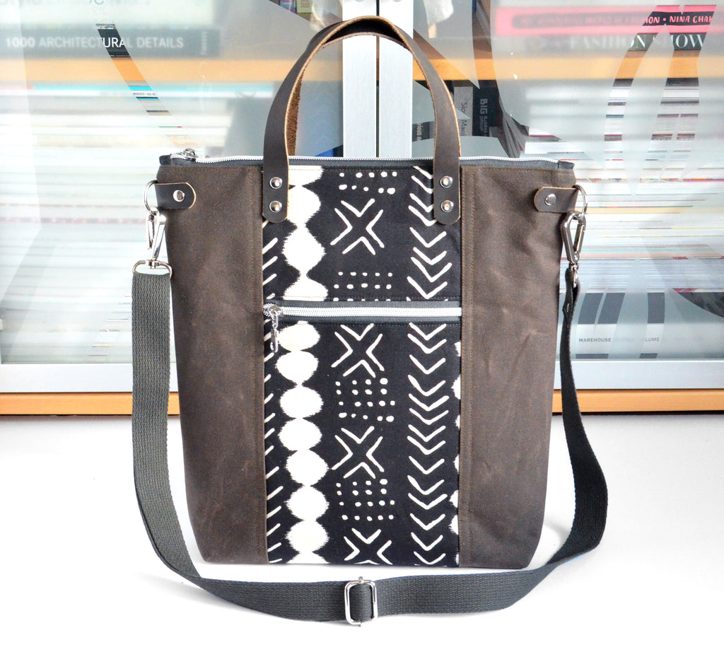 โ This tote bag features a lovely chocolate brown & greyย waxed-canvasย exterior, with a beautiful blackย mudcloth-printย canvas feature panel!ย This bag includes a coordinating adjustable crossbody strap.