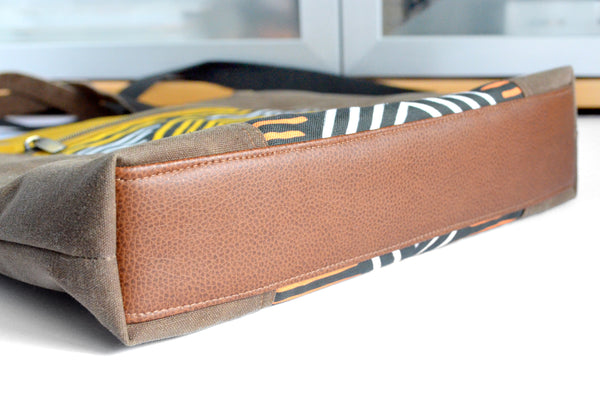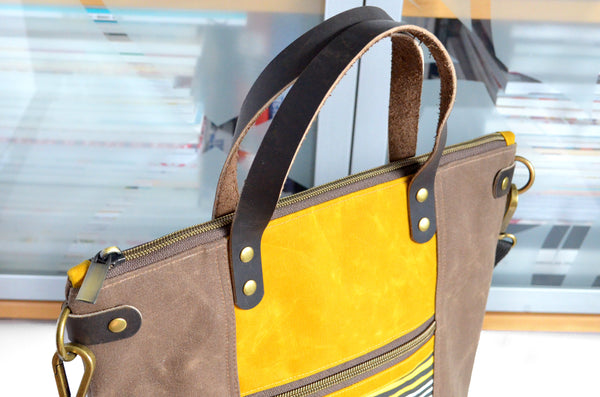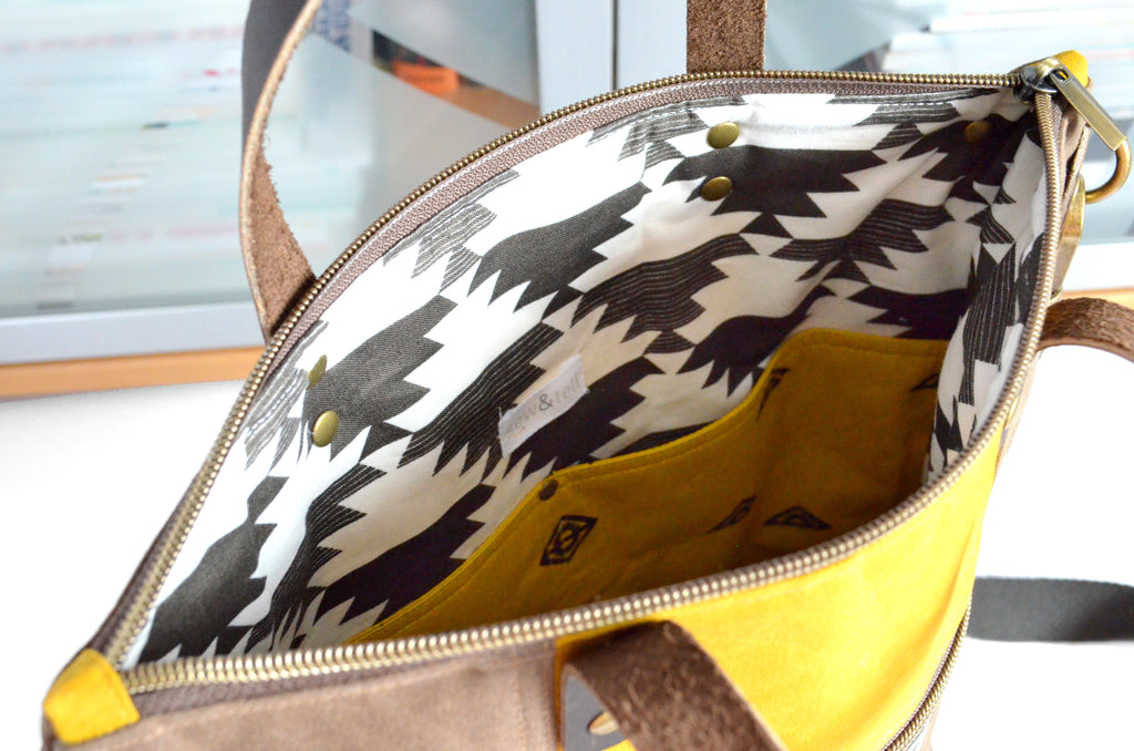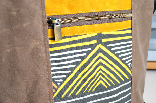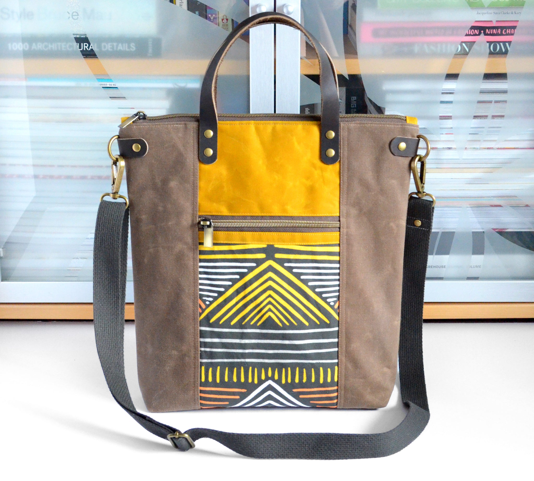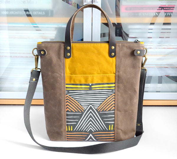 โ This tote bag features a lovelyย saddle brown & yellowย waxed-canvasย exterior, with aย boho mountain-print canvas feature panel!ย This bag includes a coordinating adjustable crossbody strap.