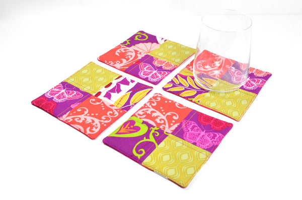 โ This set of four fabric coasters features a super bright set of pink, orange, and yellow prints, with summery butterflies and floral motifs! Please note that fabric placement may vary, as these are large-scale prints.