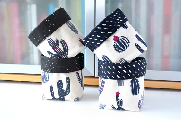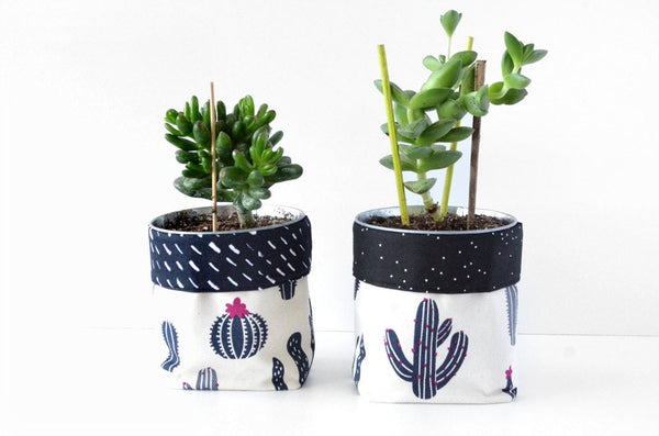These fun fabric plant pots are made from a variety of beautiful cotton-canvas prints, with bright coordinating lining fabrics which peek out the top! These fabric covers are the perfect solution to the ugly plastic pot your plant comes home in from the store, with no more need for messy re-potting. Just slip your existing plant pot into this bin, and voila! Theyโre even height-adjustable to perfectly suit different sizes of plants, or when adapting these bins for other specific needs. These little buckets also make the perfect container for holding pens and pencils on your desk, cosmetic brushes in the bathroom, essential oils on your nightstand, or any other odds and ends you need to keep organized. Their versatile uses make these a great gift for gardeners, co-workers, teachers, or yourself!