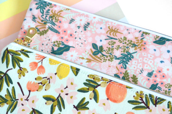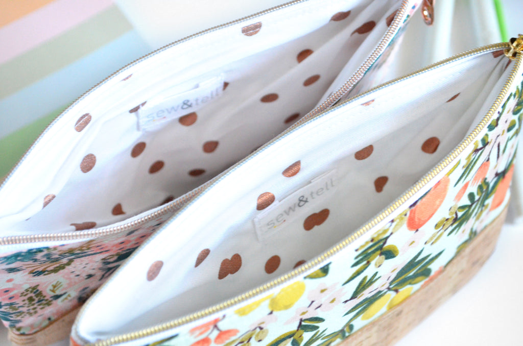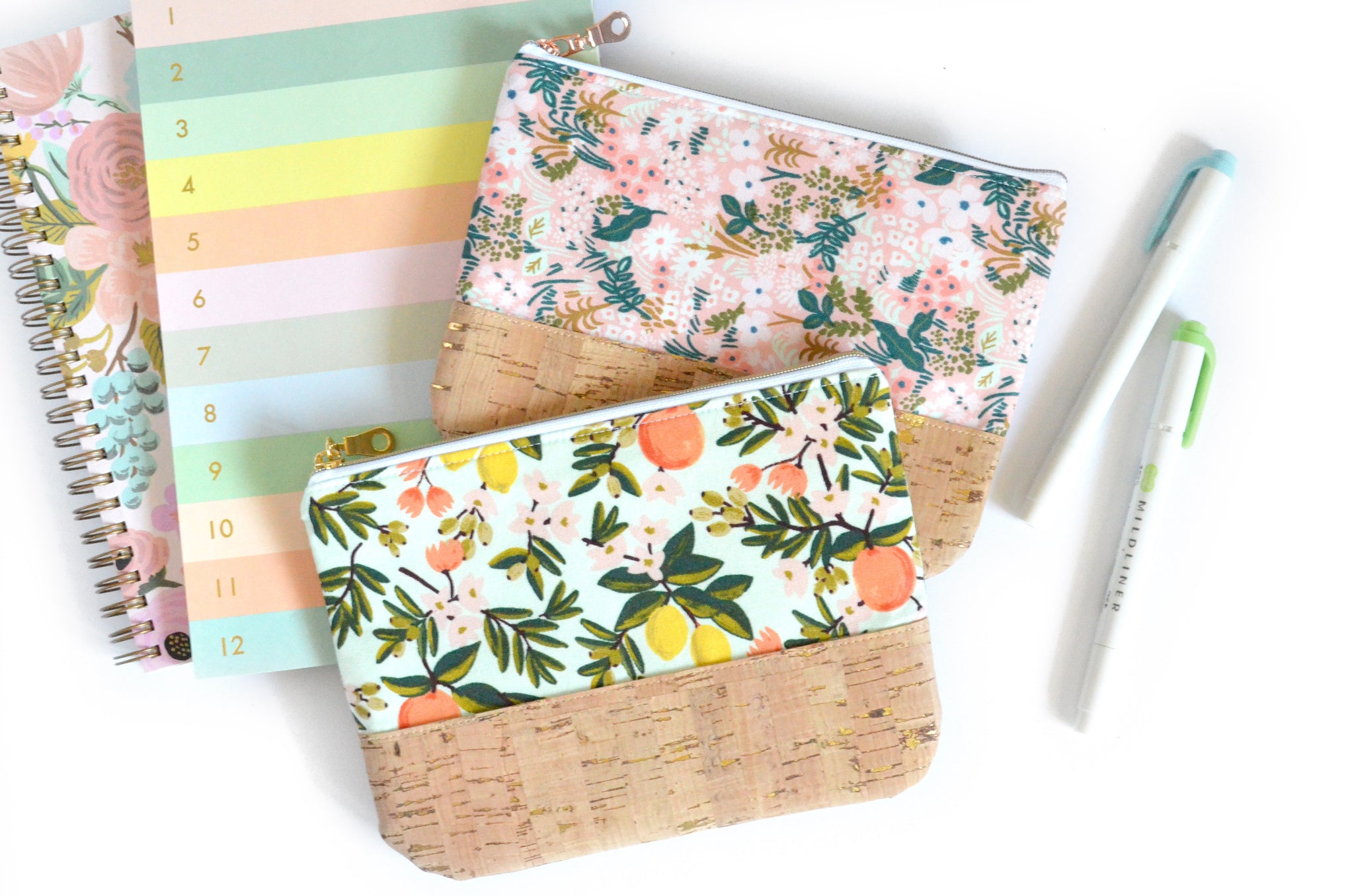 ★ These floral print pouches feature beautiful fabrics from Rifle Paper Co., which are accented with a cork leather bottom