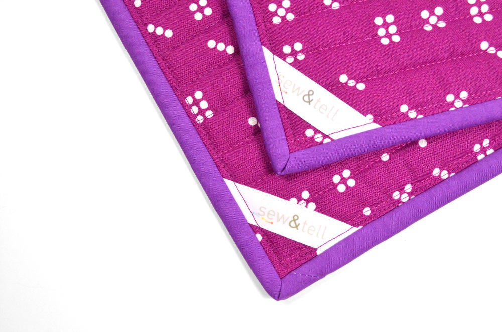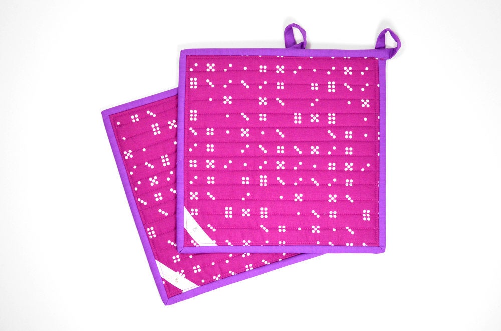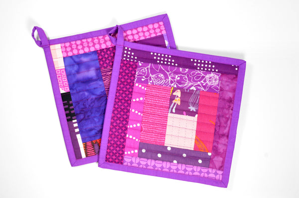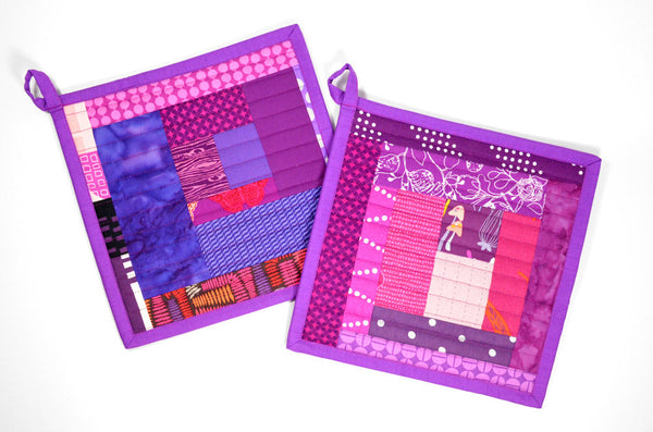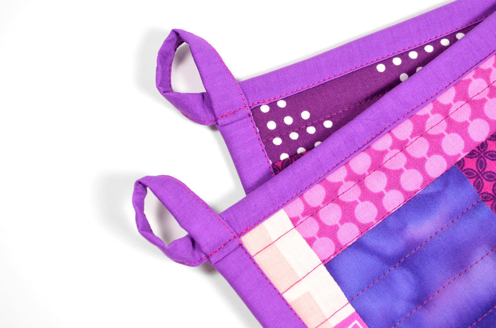 โ This purple potholder set features a beautiful mix of cotton fabrics, sewn and quilted into a modern take on the traditional โlog-cabinโ quilt block.