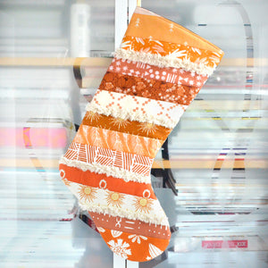 These brand new holiday stockings feature a variety of beautiful prints and patterns, sewn into a fun patchwork-strip design! Their patchwork-nature means that no two stockings are sewn together exactly the same, making each one truly a one-of-a-kind addition to your holiday decor! On the back-side you'll find a coordinating cotton fabric, with a solid colour on the interior lining.