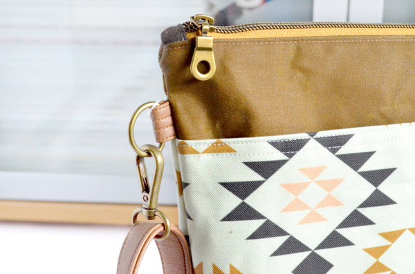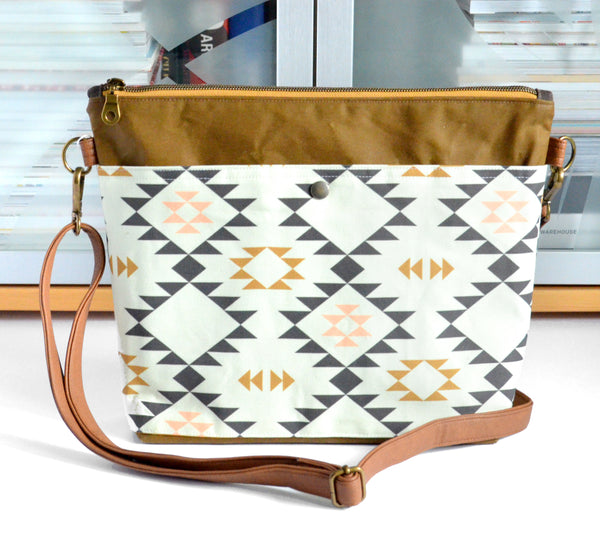 โ This crossbody bag features a lovelyย "coyote brown"ย waxed-canvasย exterior, with a beautiful boho feature fabric!ย This bag includes a coordinating adjustable faux-leather crossbody strap.