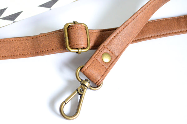 โข Includes a removable faux-leather crossbody strap which is adjustable