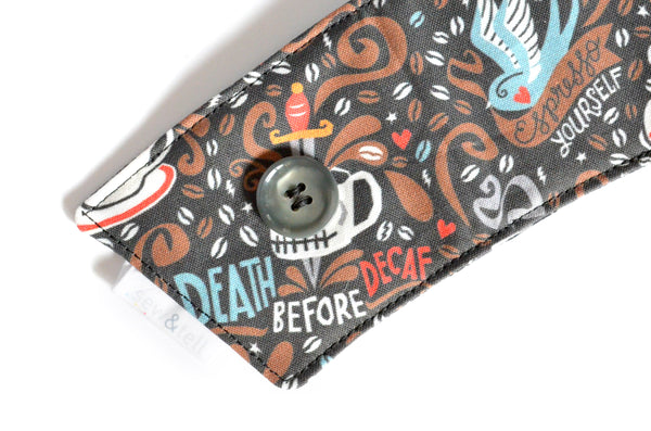 โ These brownย coffee sleeves feature a fun coffee-themed design from Canadian artist and illustrator Cynthia Frenette!ย Each one is paired with a matching button! Please note, exact fabric placement or button style may vary from some of the photos shown.