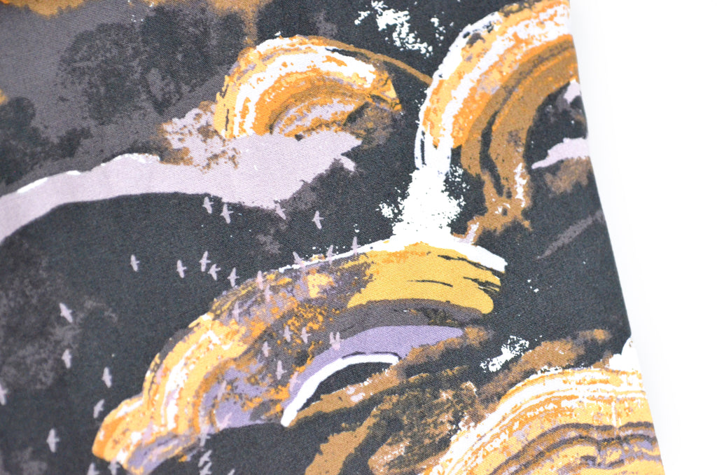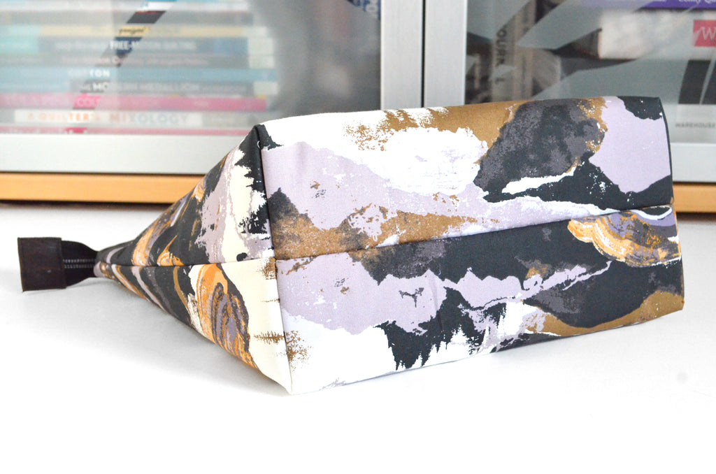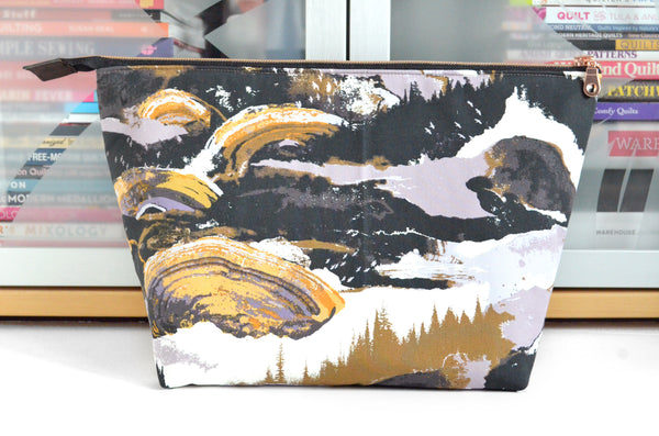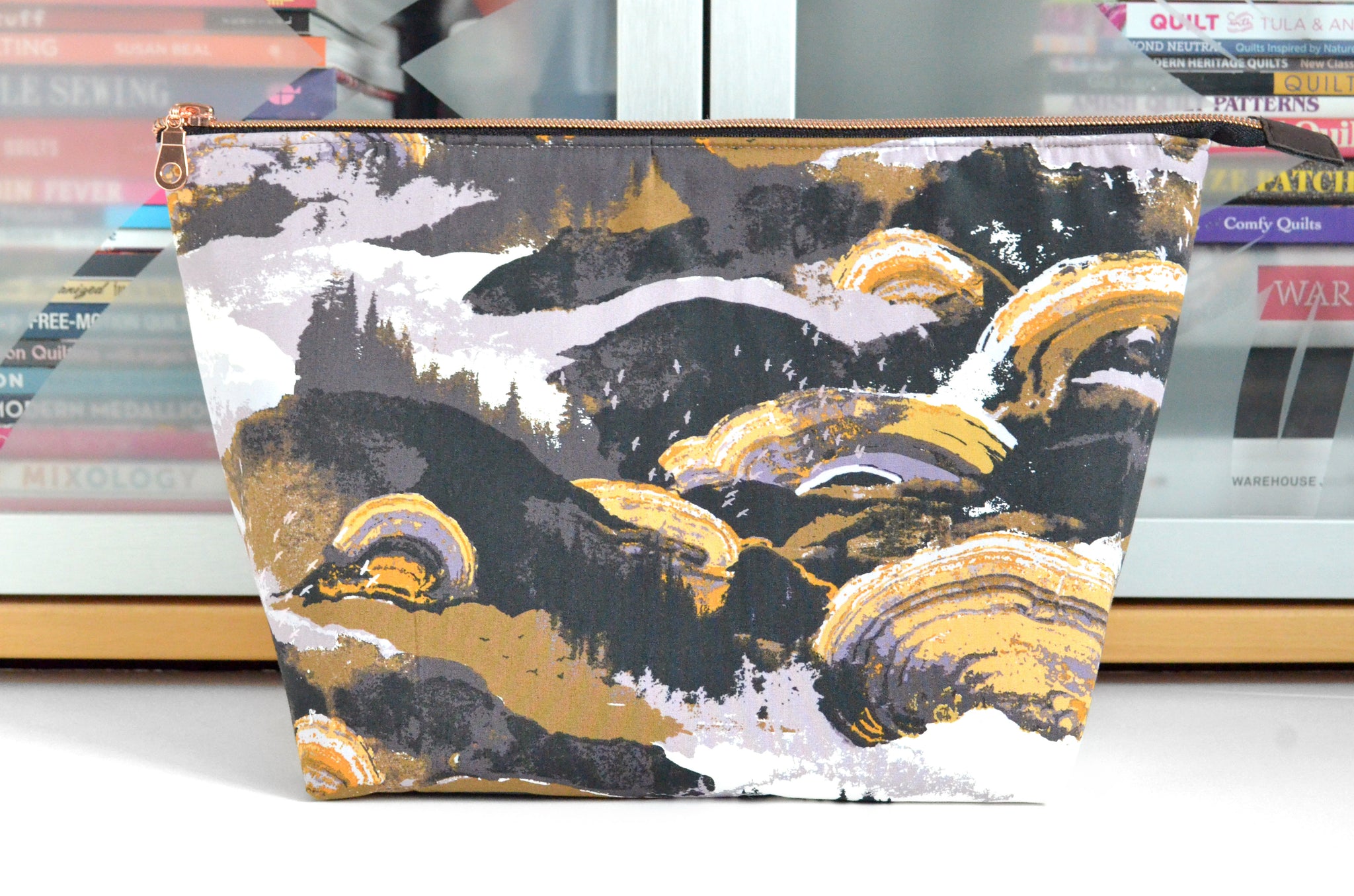 โ This brown, orange, and purple jumbo toiletryย bag is made with aย beautiful nature themed fabric, designed by Art Gallery!