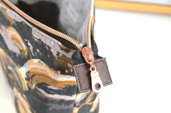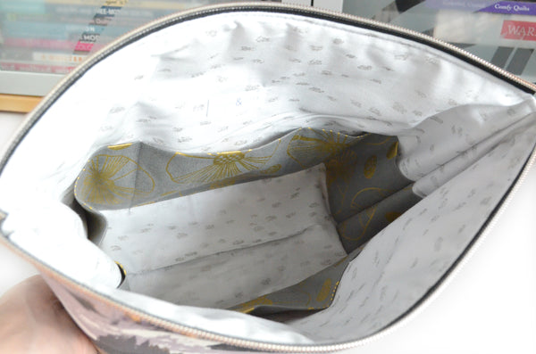 These jumbo toiletry bags were made to hold ALL the things! The largest size of zippered pouch available in our shop, these bags measure a generous 13-inches across the top and 8-inches tall, with an extra-wide gusseted bottom! They feature six interior pockets, which means you'll easily stay organized despite how much you can fit inside! Each bag is made with a gorgeous coordinating faux-metal zipper, with a cork-leather pull tab on the end for easy opening. The end of the zipper extends past the side of the bag, which means these pouches open up nice and wide to easily see everything inside. They're also made with the perfect combination of cotton batting and interfacing, which makes these bags ultra-plush yet super sturdy! Made in a wide variety of gorgeous prints and patterns, your sure to find the perfect bag for yourself or for gifting!