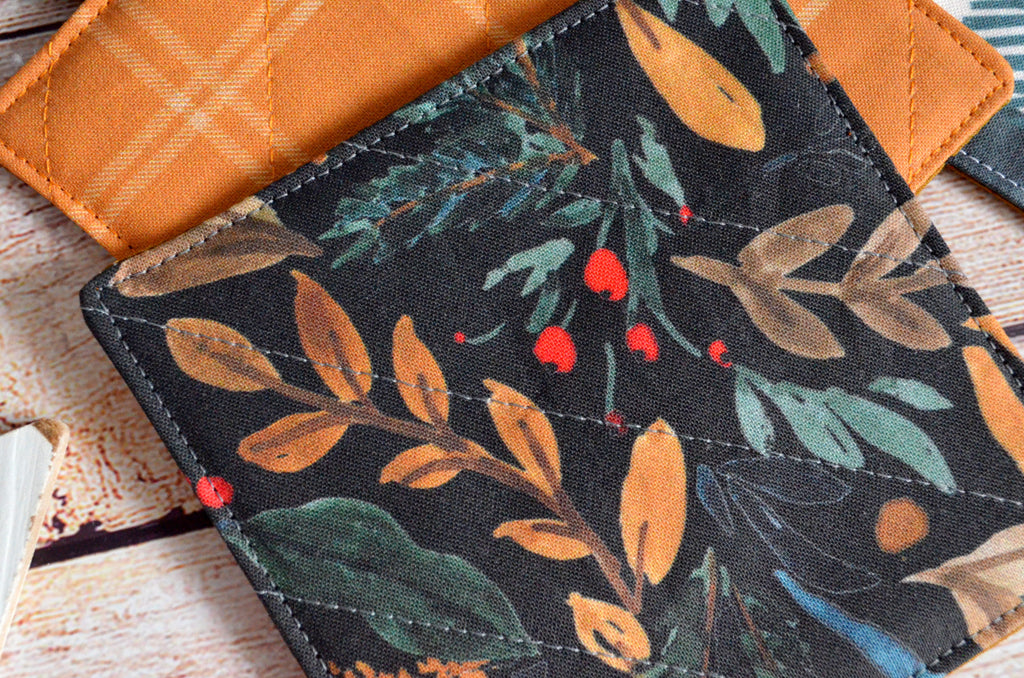 โข Coasters are reversible, with a coordinating fabric print on the back