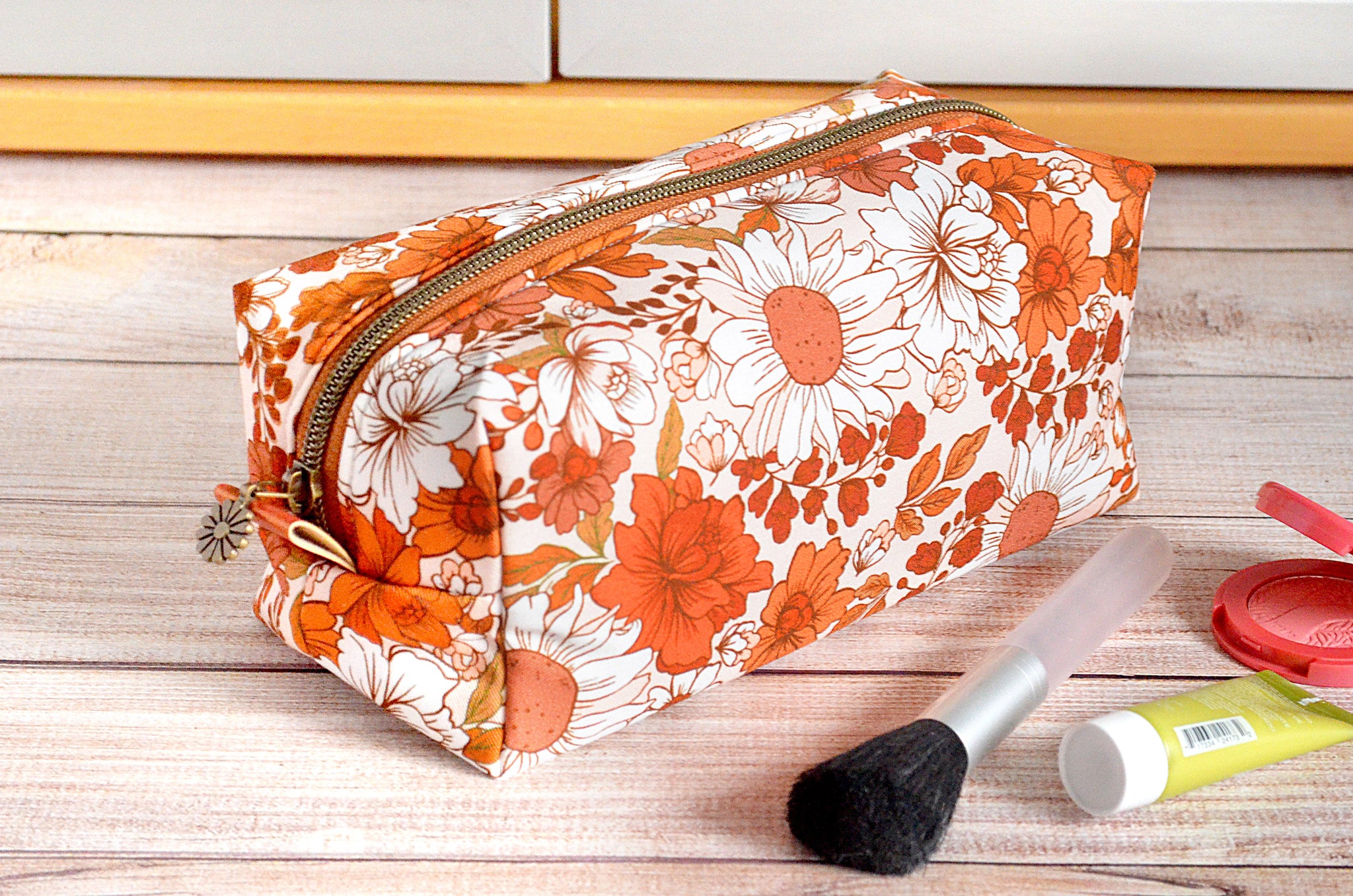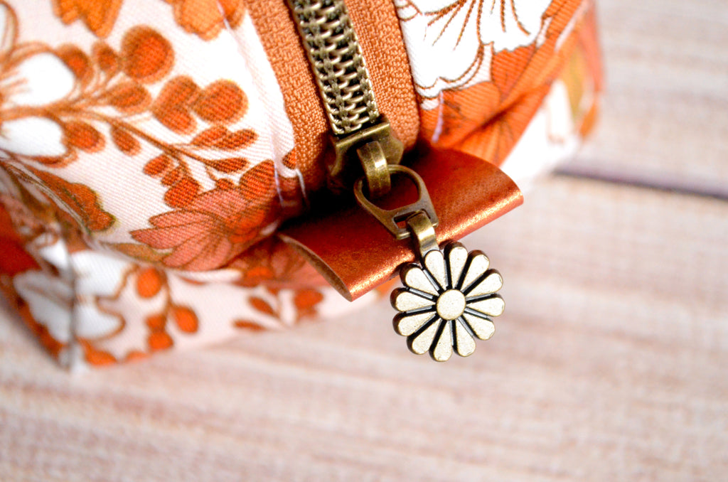 This ochre boxy bag features a beautiful fall floral fabric!ย Itย also features a matching faux-metal zipper, and coordinating cork accent zipper tabs.ย