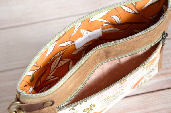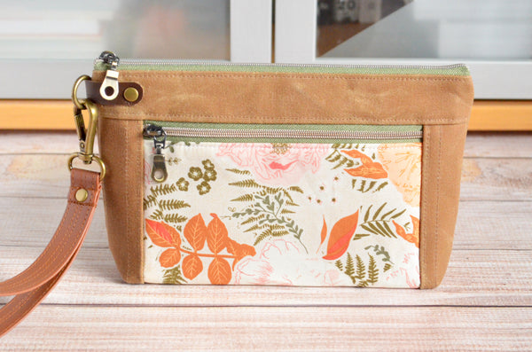 ★ This wristlet features a lovely tan-brown waxed-canvas exterior, with a beautiful floral feature panel! This bag includes a coordinating faux-leather wrist strap.