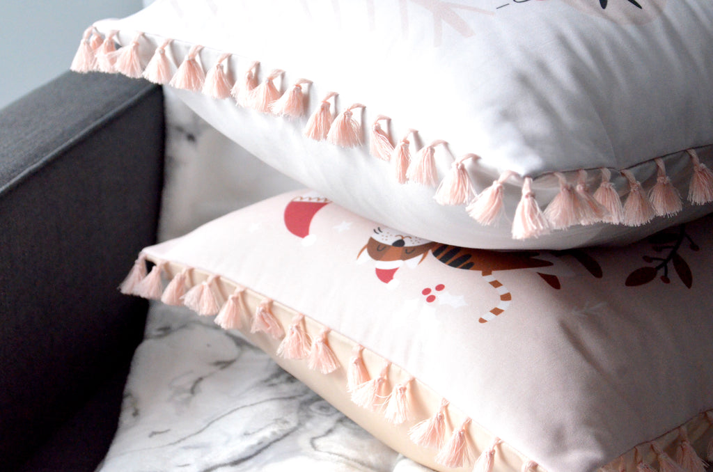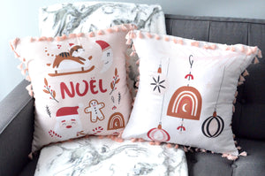 These beautiful pillow covers feature a variety of fun prints and patterns for the holidays! This year's pillow collection features graphics designed by Ksenia of Lokko Studio and Mio Buono of Mio Buono Design. On the back-side you'll find a coordinating cotton fabric, finished off with a lovely pom-pom or tassel fringe trim!