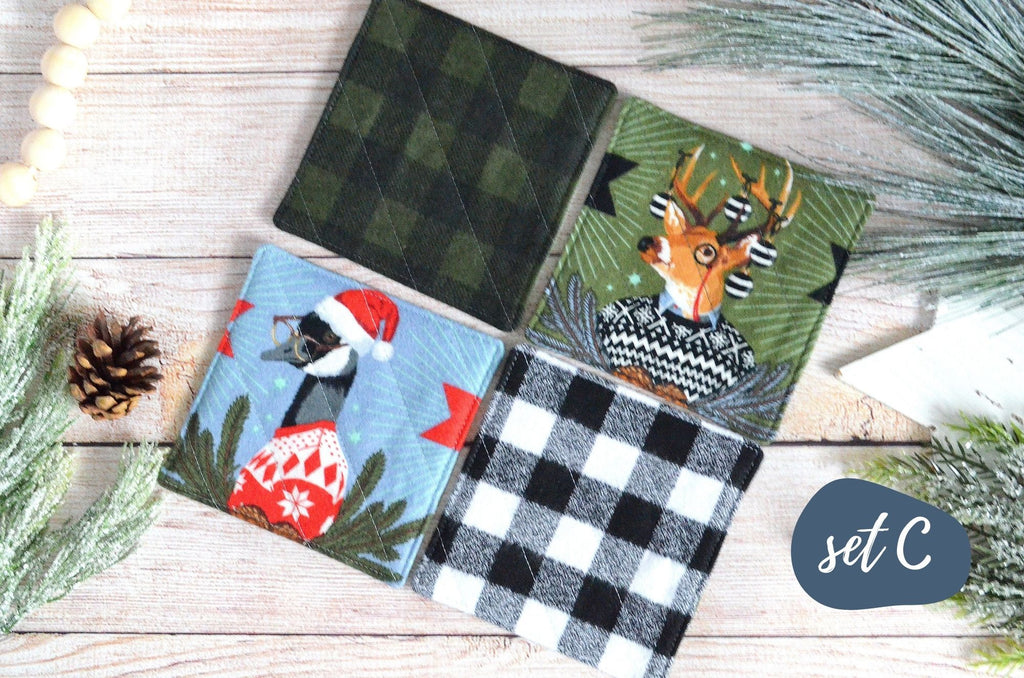 โ This set of four fabric coasters is made with a fun selection of flannel fabrics, featuring plaids and animals! Please note, exact fabric placement may vary from some of the photos shown.