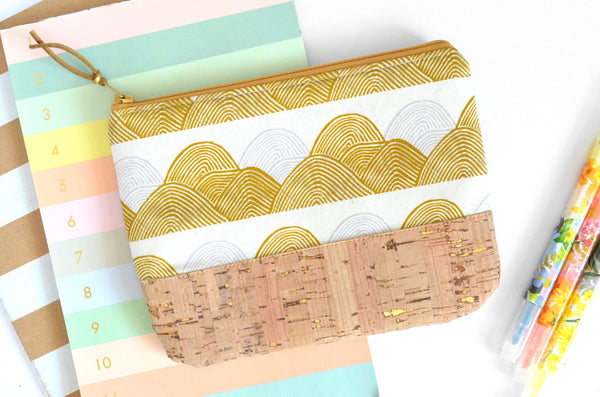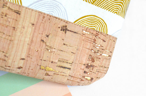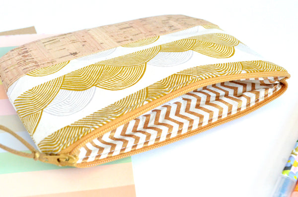★ This yellow & white pouch features a beautiful geometric print fabric, and is accented with a metallic fleck cork leather bottom