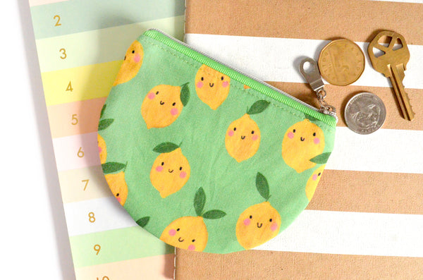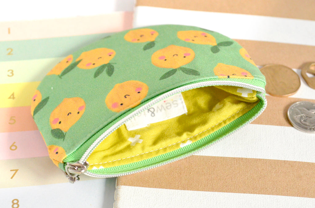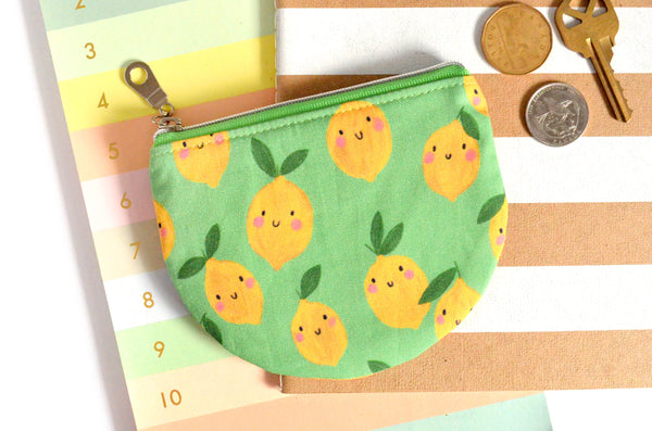 โ ย This green coin purse features a fun lemon print fabric, with a coordinating print on the inside!ย