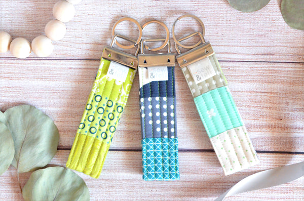 โ ย These key fobs feature a beautiful mix of cotton fabrics in a variety of prints and colours, quilted with beautiful straight-lines in a coordinating thread