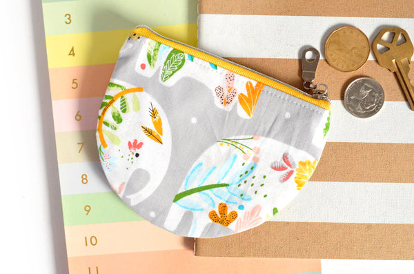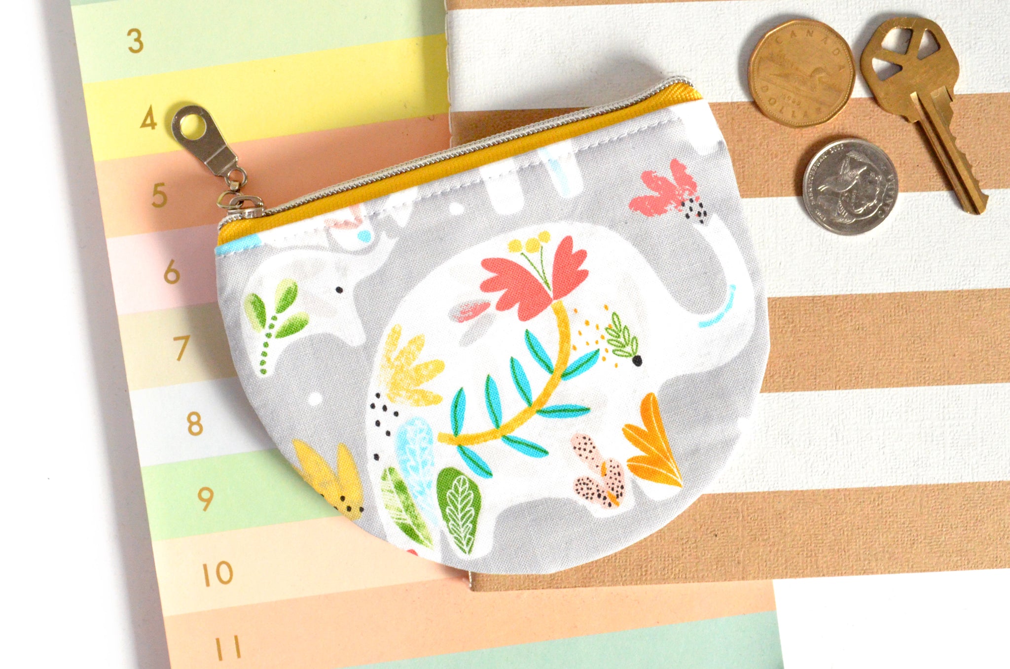 โ ย This grey coin purse features a fun elephant print fabric, with a coordinating print on the inside!ย