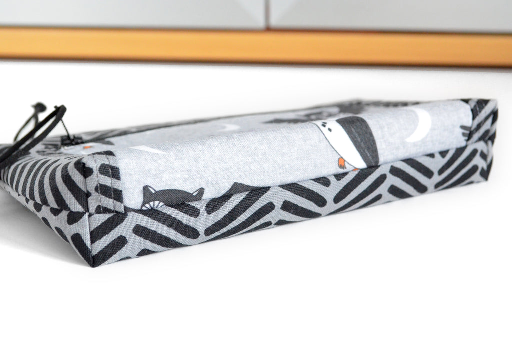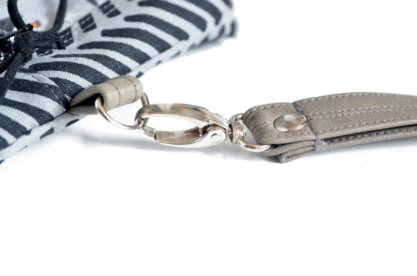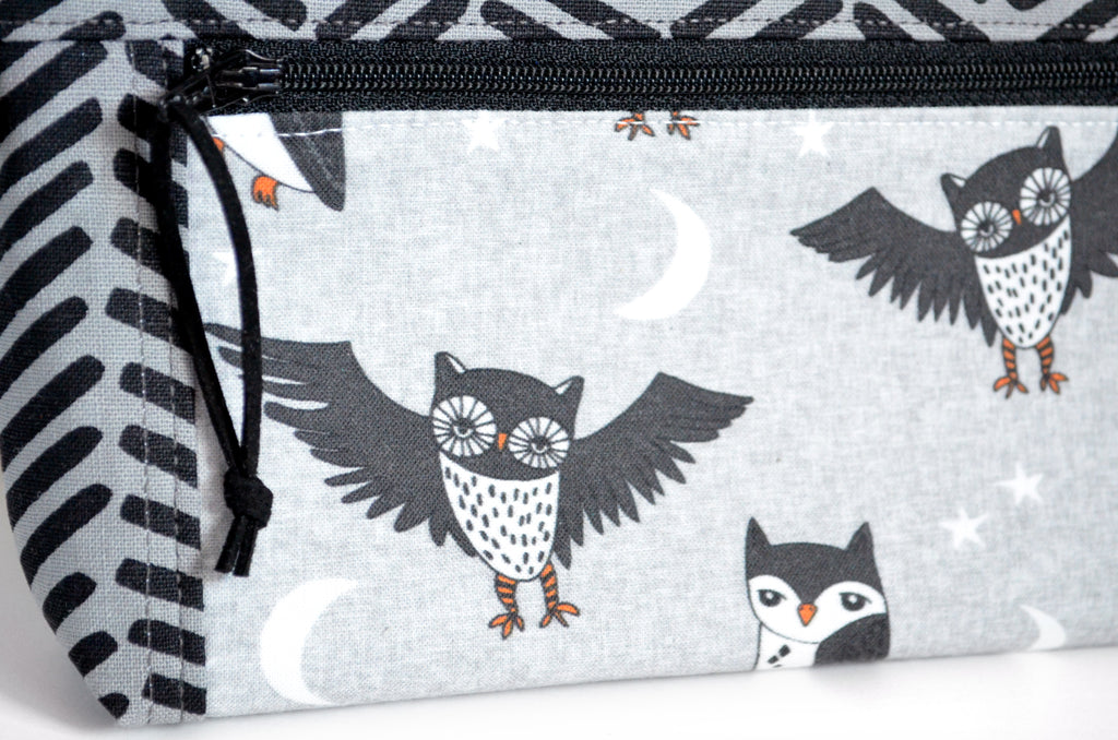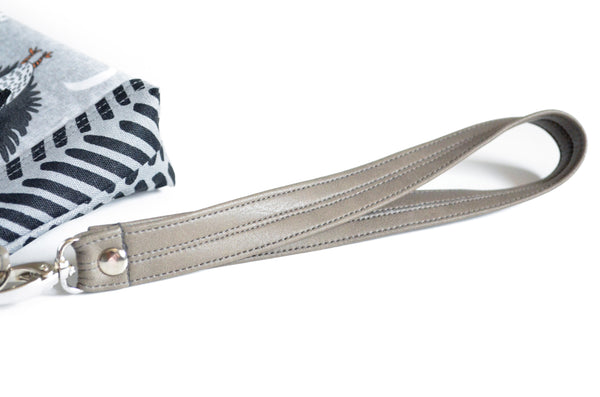 ★ This wristlet features a beautiful grey linen fabric which has been screenprinted with a black geometric design, paired with a lovely grey owl print cotton designed by Andrea Lauren! Included is a coordinating grey faux-leather wrist strap.