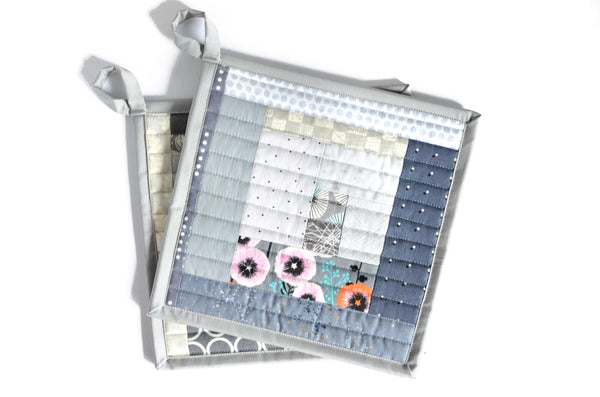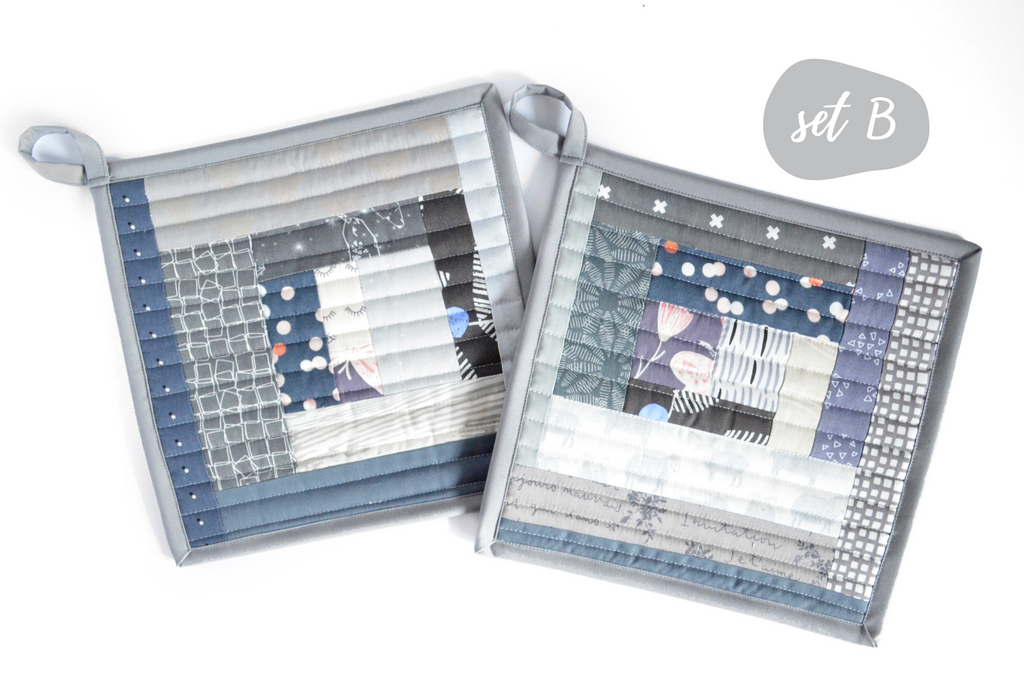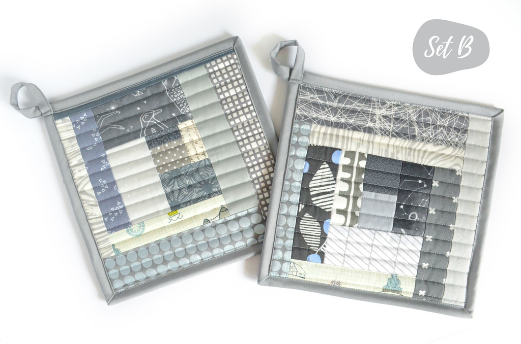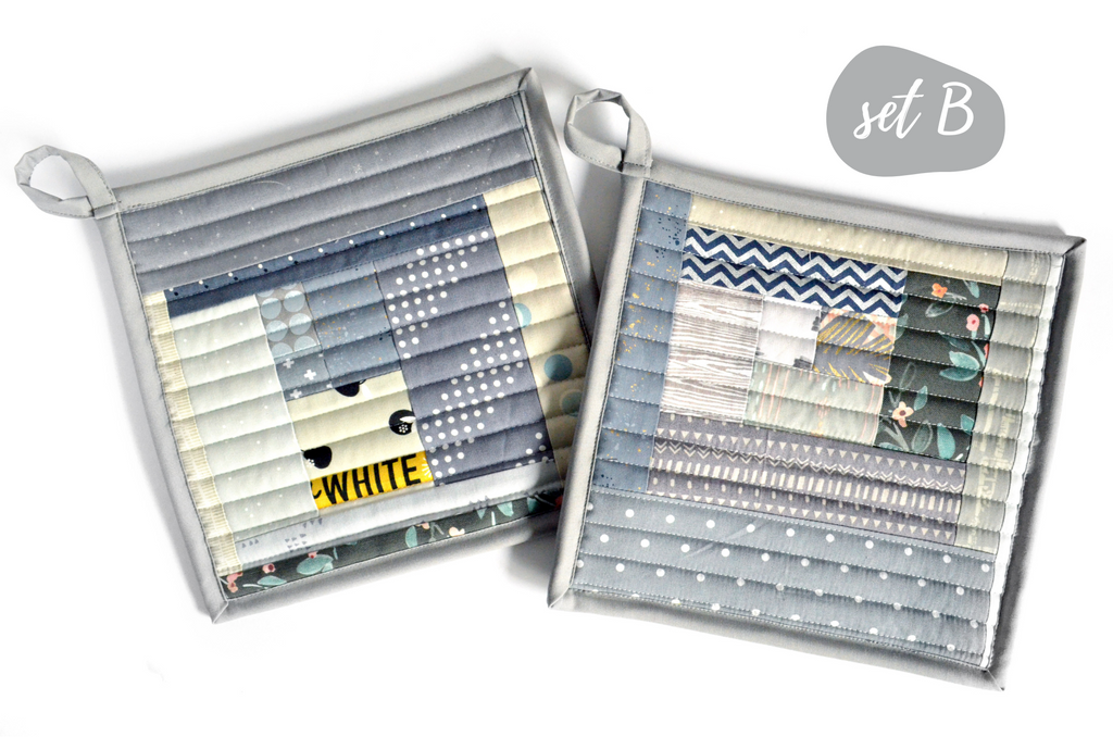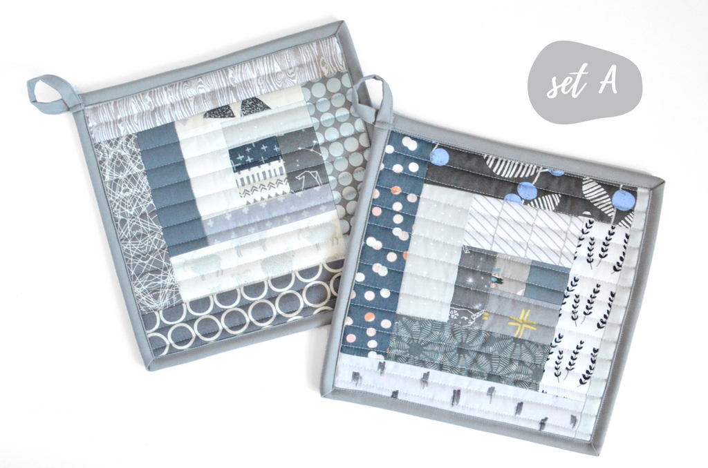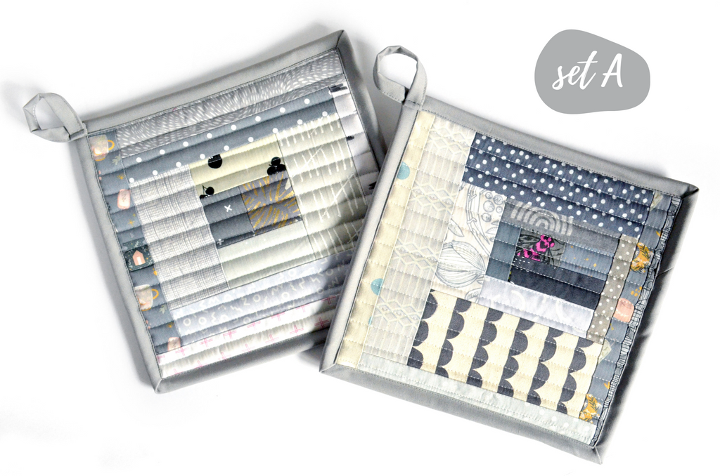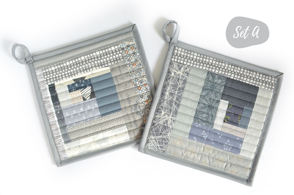 โ This grey potholder set features a beautiful mix of cotton fabrics, sewn and quilted into a modern take on the traditional โlog-cabinโ quilt block.