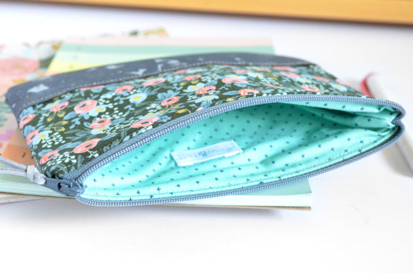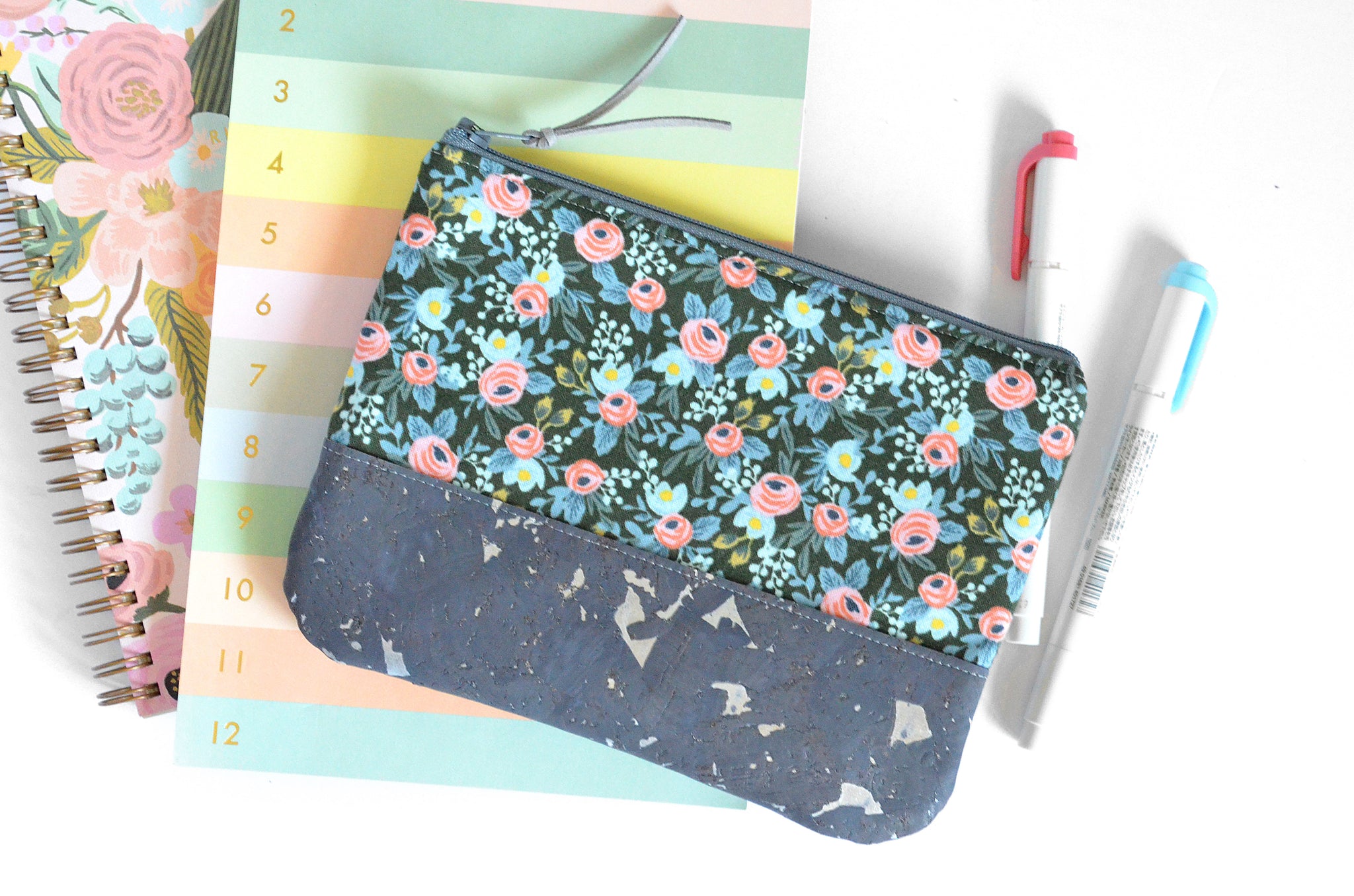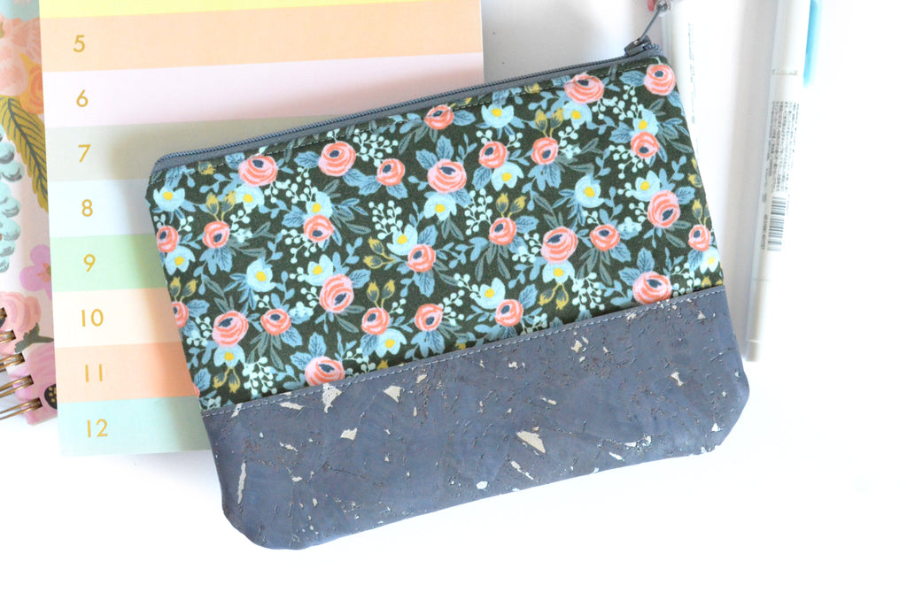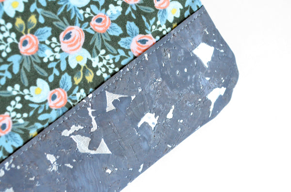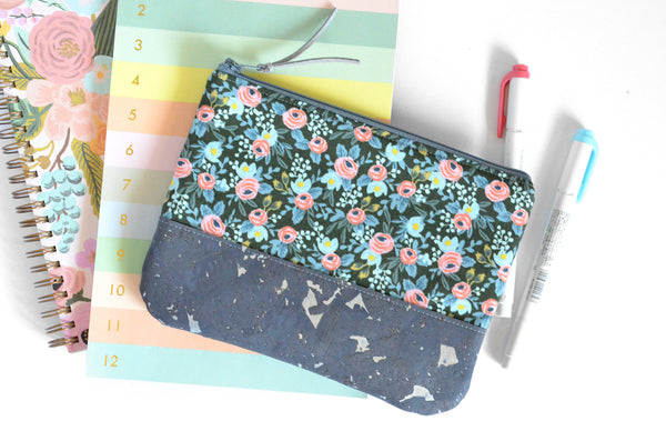★ This grey floral print pouch features a beautiful fabric from Rifle Paper Co., and is accented with a cork leather bottom