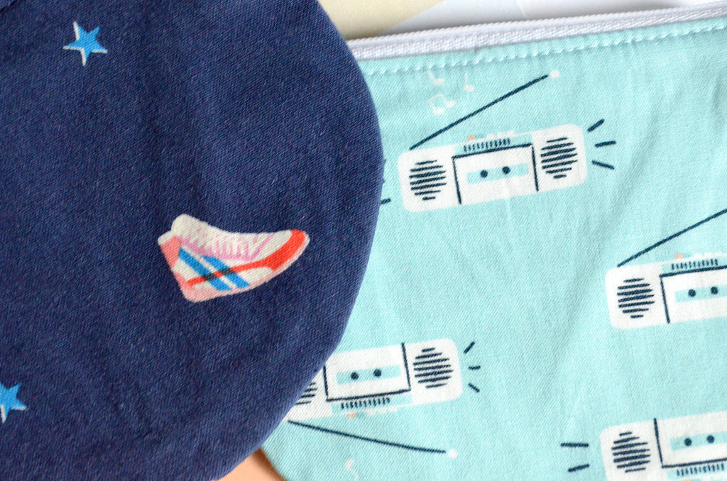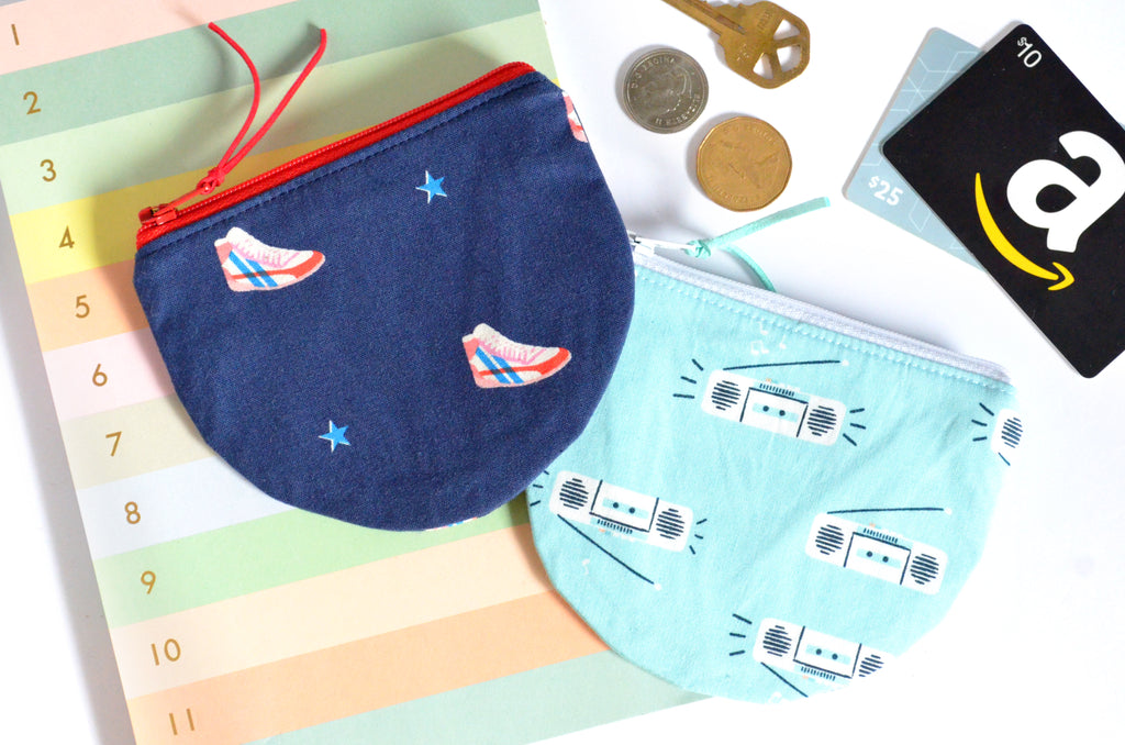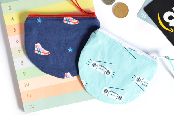 โ This navy & light blue coin purse features a fun set of sneaker & boombox print fabrics!ย