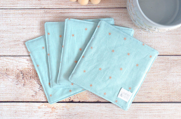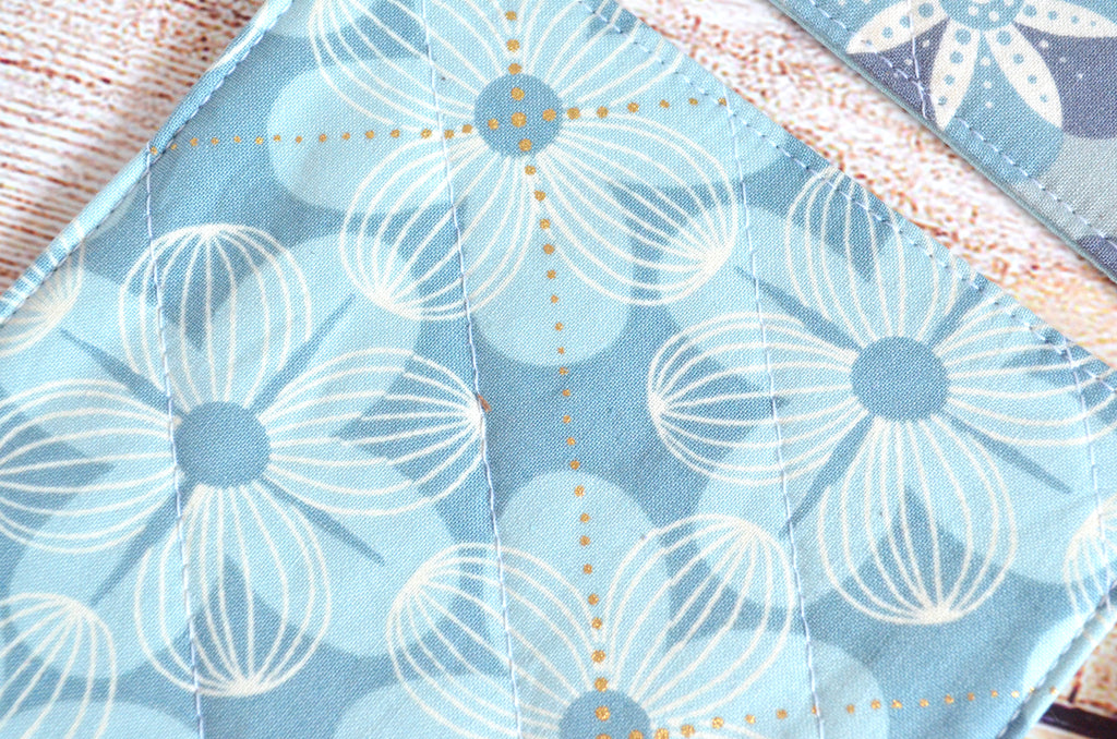 โข Coasters are reversible, with a coordinating fabric print on the back