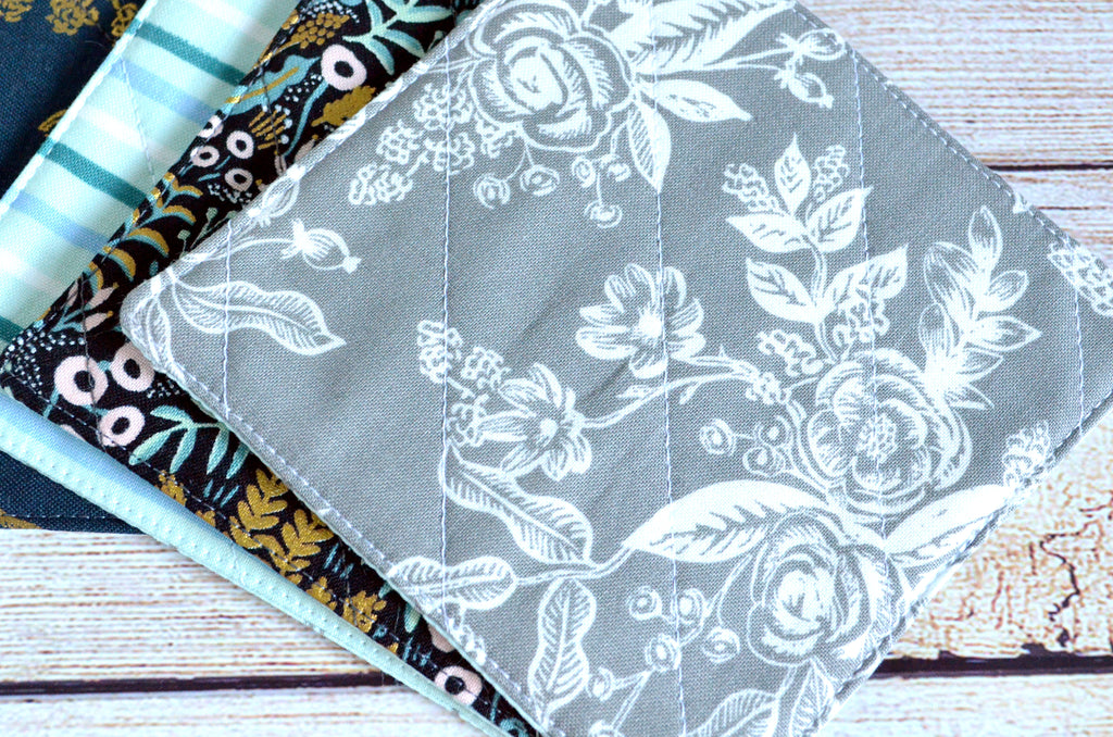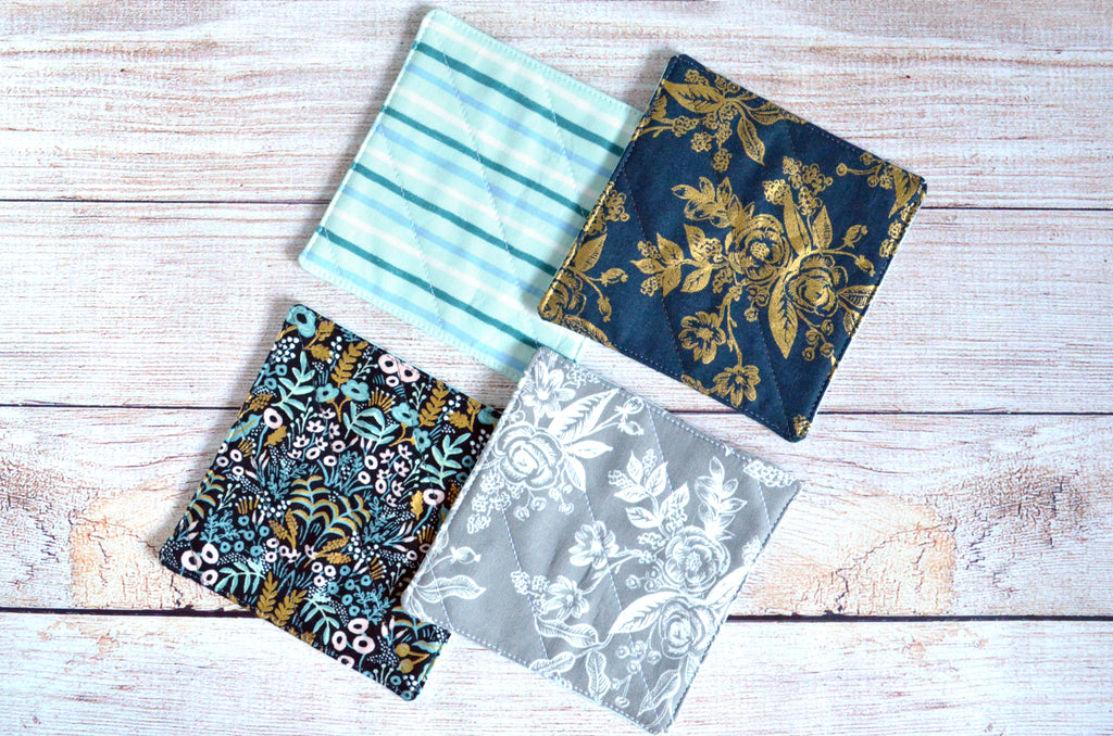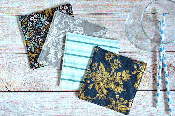 โ This set of four fabric coasters features a beautiful selection of metallic Rifle Paper Co fabrics, perfect for patio season!