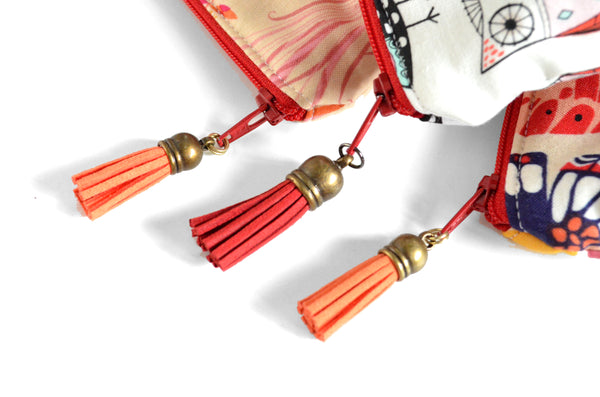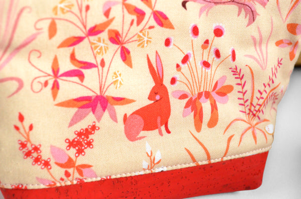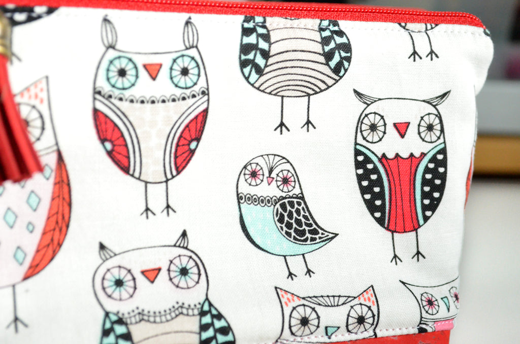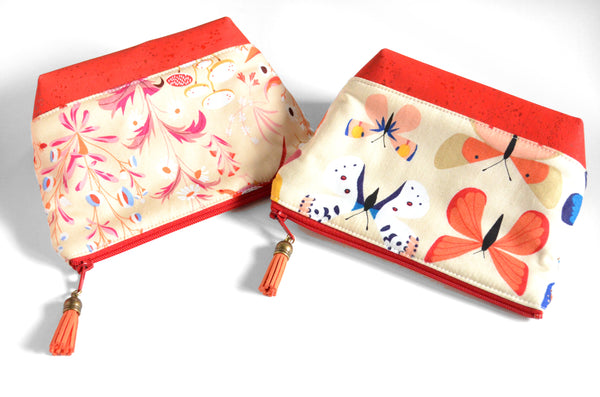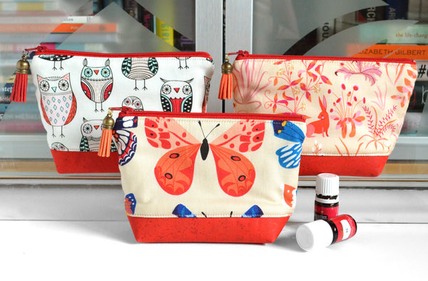 โ These red essential oil pouches feature a fun series of butterfly, owl, and bunny fabrics, accented by bright and beautiful cork leather bottoms!ย