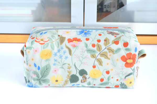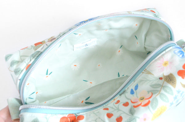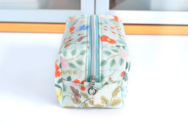 โ This mint blueย boxy bag features a beautifulย floral fabric designed by Rifle Paper Co!ย Itย also features a matching faux-metal zipper, and coordinating cork accent zipper tabs.ย Please note, exact fabric placement may vary from some of the photos shown.