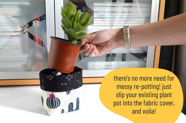 These fun fabric plant pots are made from a variety of beautiful cotton-canvas prints, with bright coordinating lining fabrics which peek out the top! These fabric covers are the perfect solution to the ugly plastic pot your plant comes home in from the store, with no more need for messy re-potting. Just slip your existing plant pot into this bin, and voila! Theyโre even height-adjustable to perfectly suit different sizes of plants, or when adapting these bins for other specific needs. These little buckets also make the perfect container for holding pens and pencils on your desk, cosmetic brushes in the bathroom, essential oils on your nightstand, or any other odds and ends you need to keep organized. Their versatile uses make these a great gift for gardeners, co-workers, teachers, or yourself!