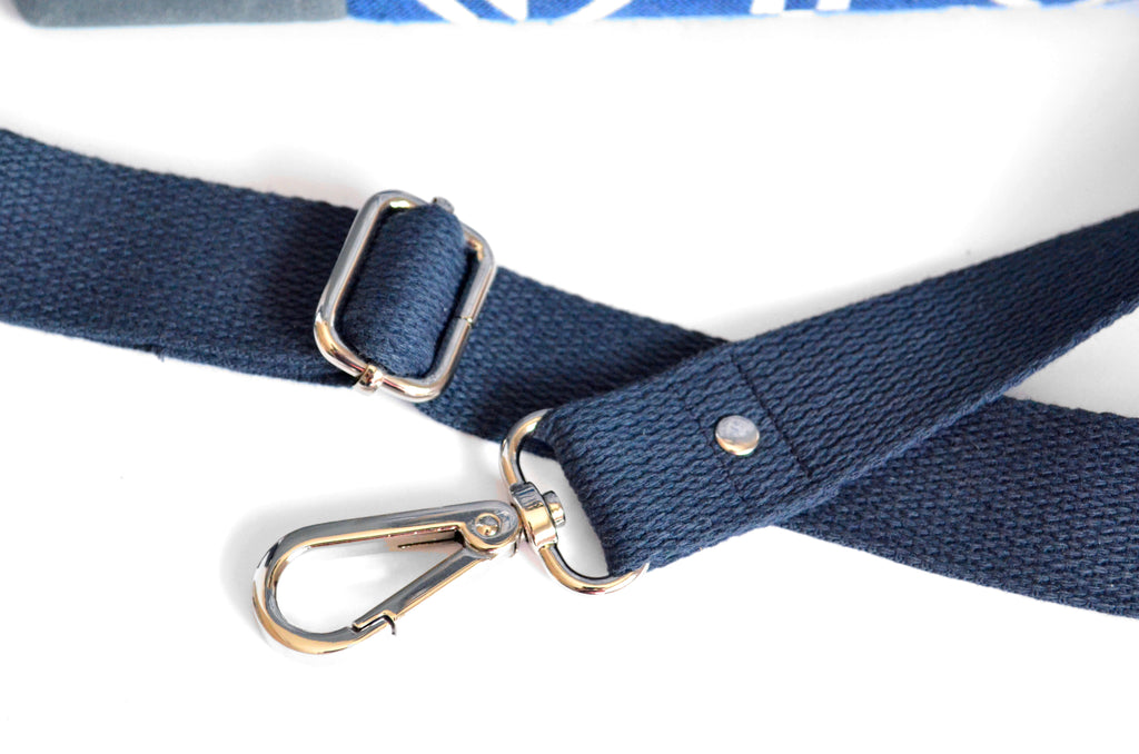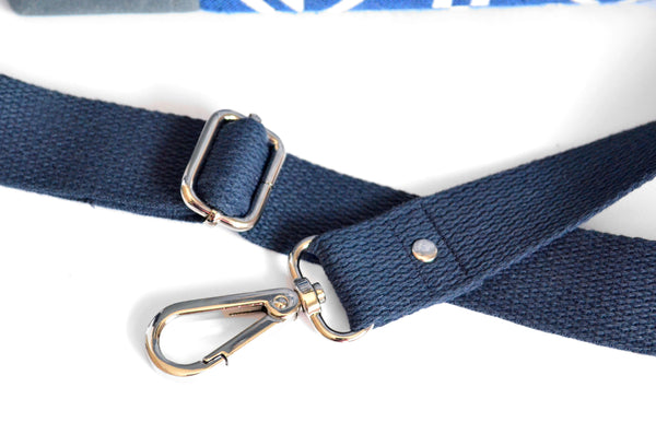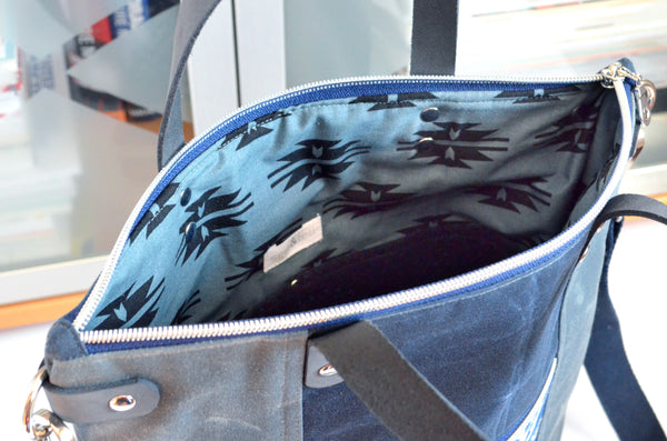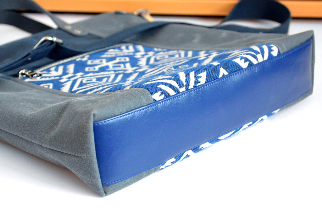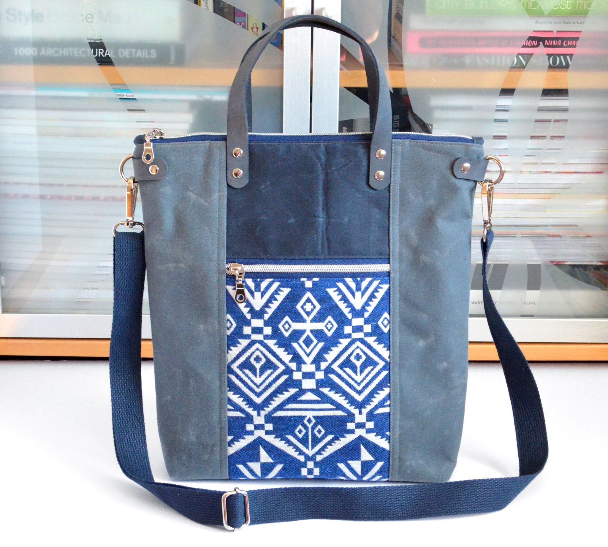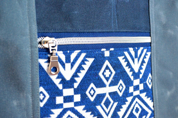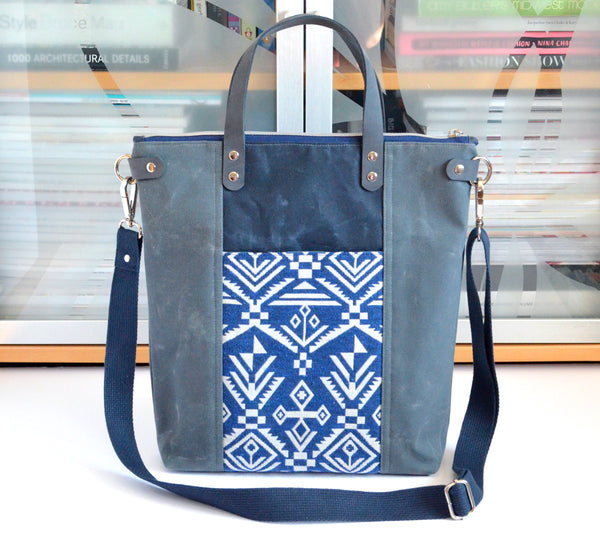 โ This tote bag features a lovely navy blue & greyย waxed-canvasย exterior, with aย boho woven fabric feature panel!ย This bag includes a coordinating adjustable crossbody strap.